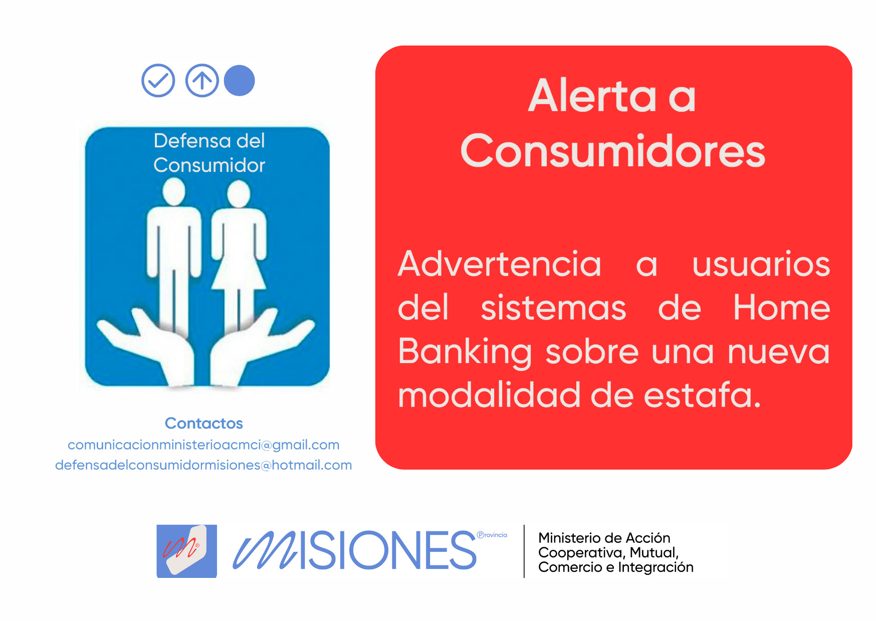 El ministerio de Acción Cooperativa de Misiones, a través de la Dirección de Comercio Interior alertó a los usuarios de sistemas Home Banking sobre una nueva modalidad para acceder a sus datos y claves bancarias de forma indebida.