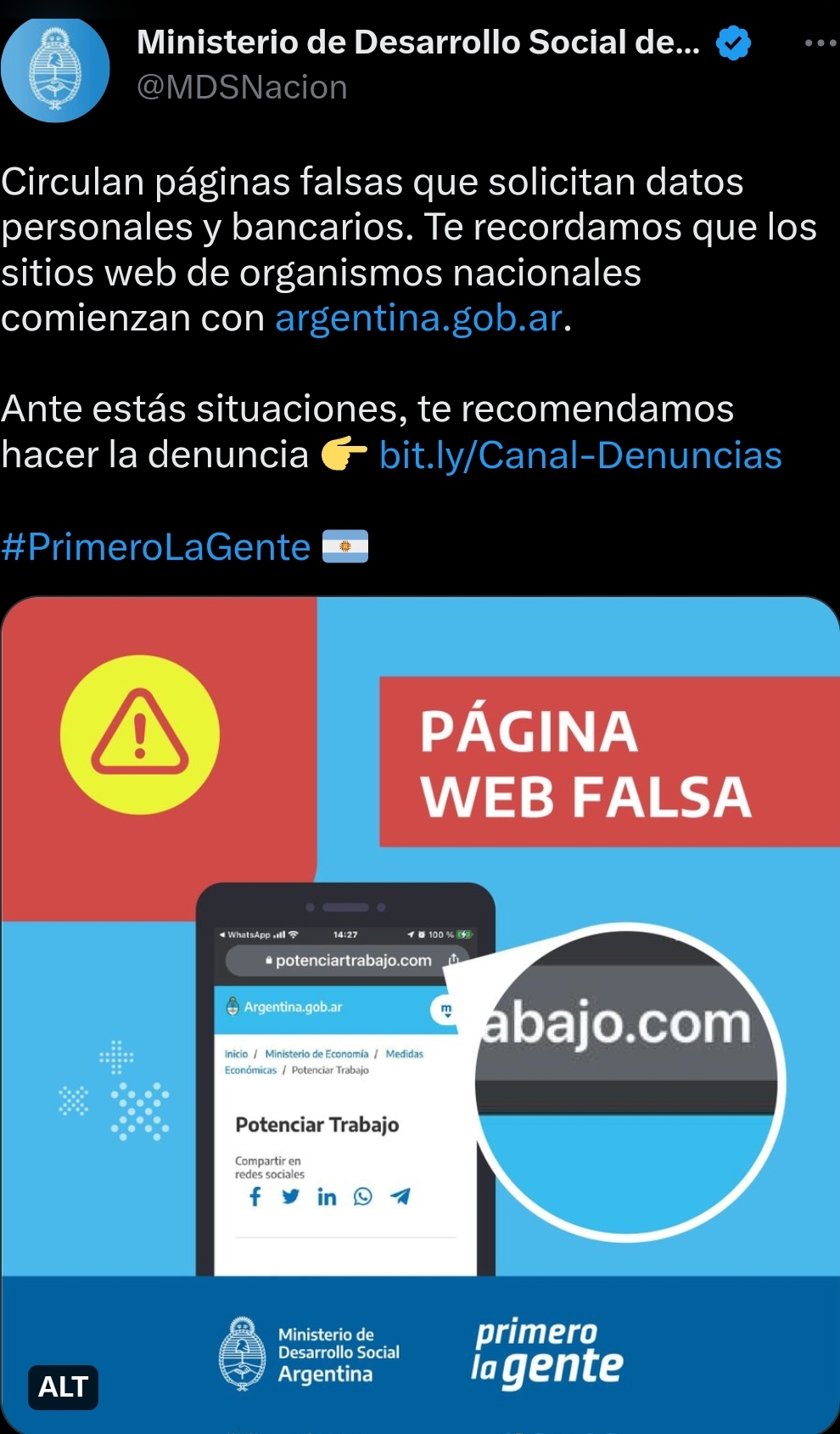 Sin embargo, el caso más reciente que dio a conocer el departamento oficial es la de la creación de páginas fraudulentas en base al programa social Potenciar Trabajo. Estos sitios imitan a los del Gobierno Nacional de manera tal que los usuarios ingresan sus datos con el fin de cobrar su beneficio.