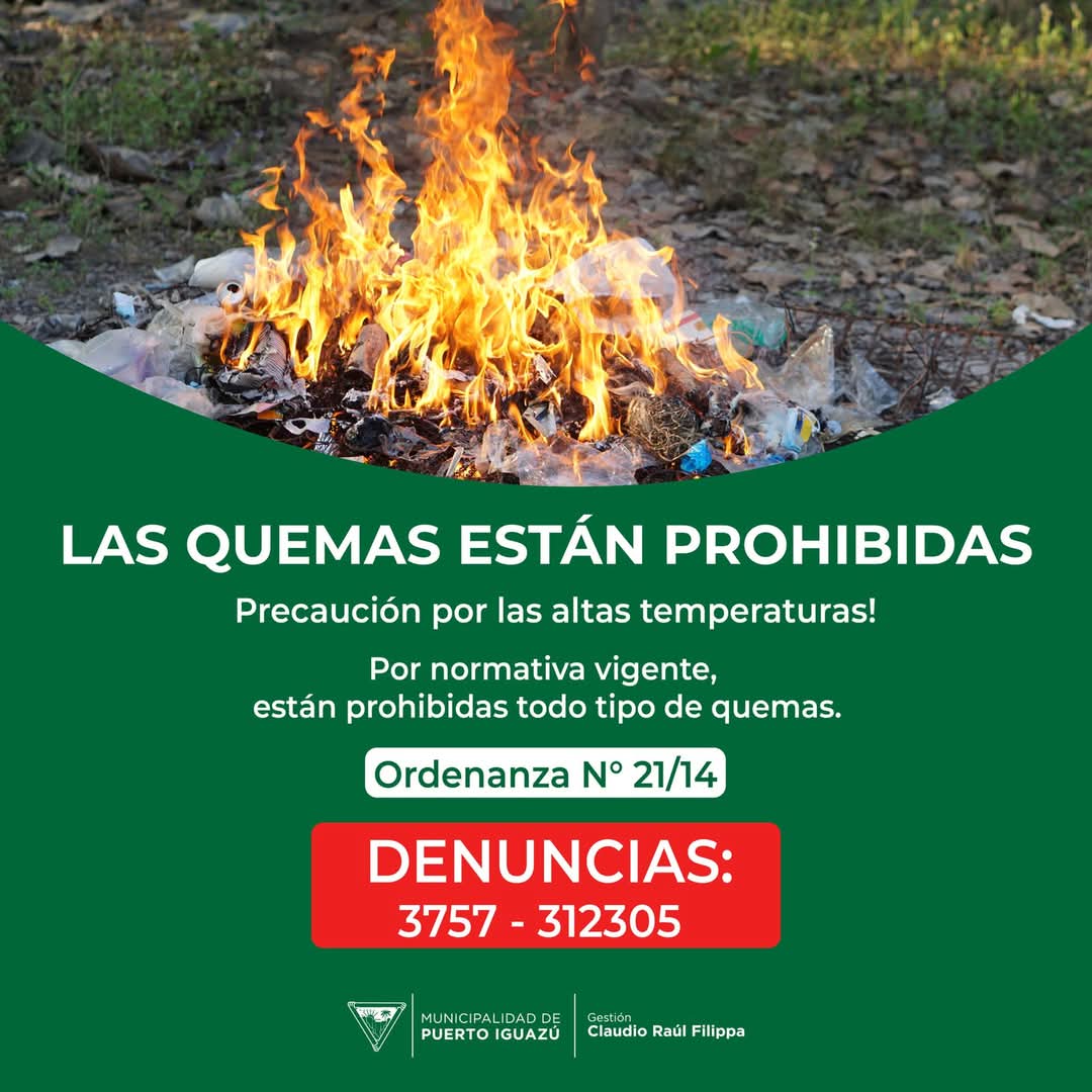 Según la Ordenanza N° 21/14, las quemas están estrictamente prohibidas. Colaboremos en la prevención de incendios y hagamos nuestra parte para proteger nuestro entorno natural y nuestras familias.Si detectás alguna quema o situación de riesgo, no dudes en actuar.Línea de denuncias: 3757 312305