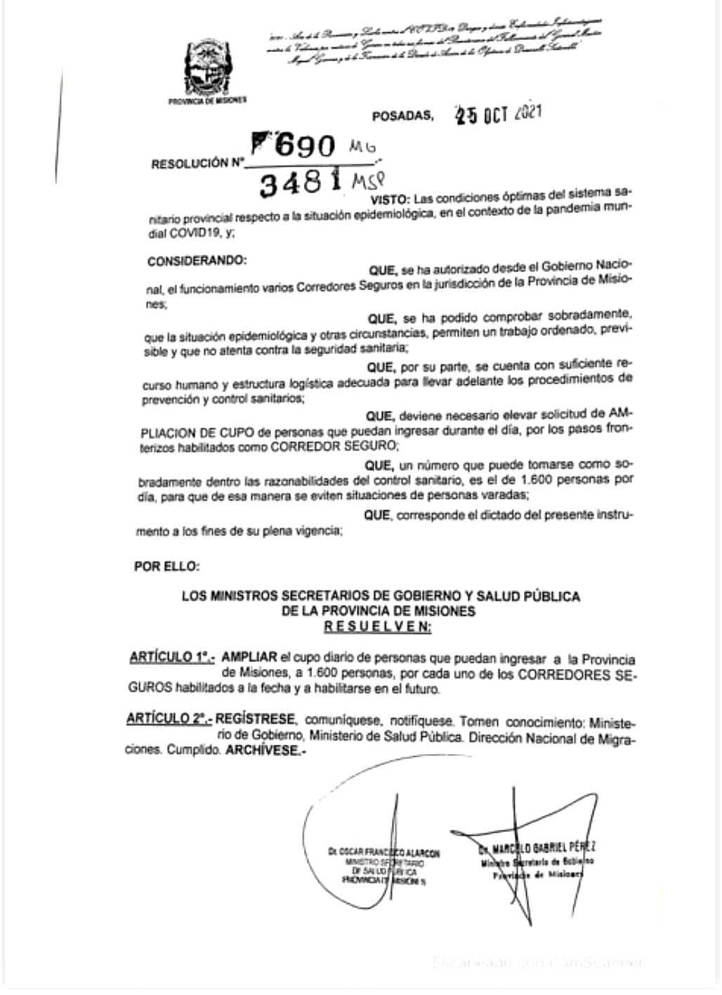 Para evitar la situación de personas varadas en los pasos fronterizos, Misiones solicitó a la nación ampliar este cupo con la firma del ministro de Salud Pública de la provincia, Oscar Alarcón y de Marcelo Pérez, ministro de Gobierno, para que el cupo de ingreso diario se extienda a 1600 personas en todos los corredores seguros habilitados y los próximos a habilitarse.