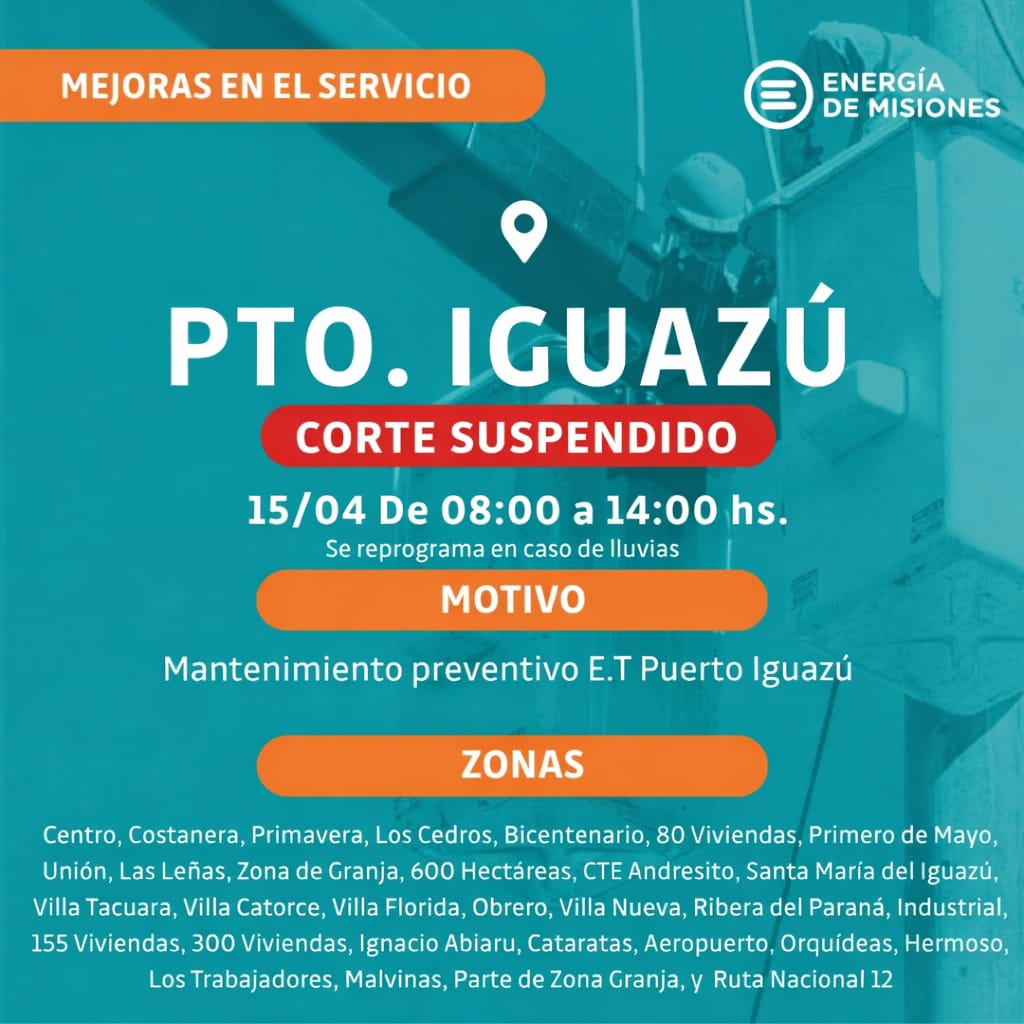 Debido a la alerta meteorológica vigente para la región, Energía de Misiones informó que ha quedado suspendido el corte de suministro eléctrico que estaba previsto para mañana miércoles 15 de abril. La interrupción, que iba a extenderse de 08:00 a 14:00 horas, tenía como objetivo realizar tareas de mantenimiento preventivo en la Estación Transformadora de Puerto Iguazú.