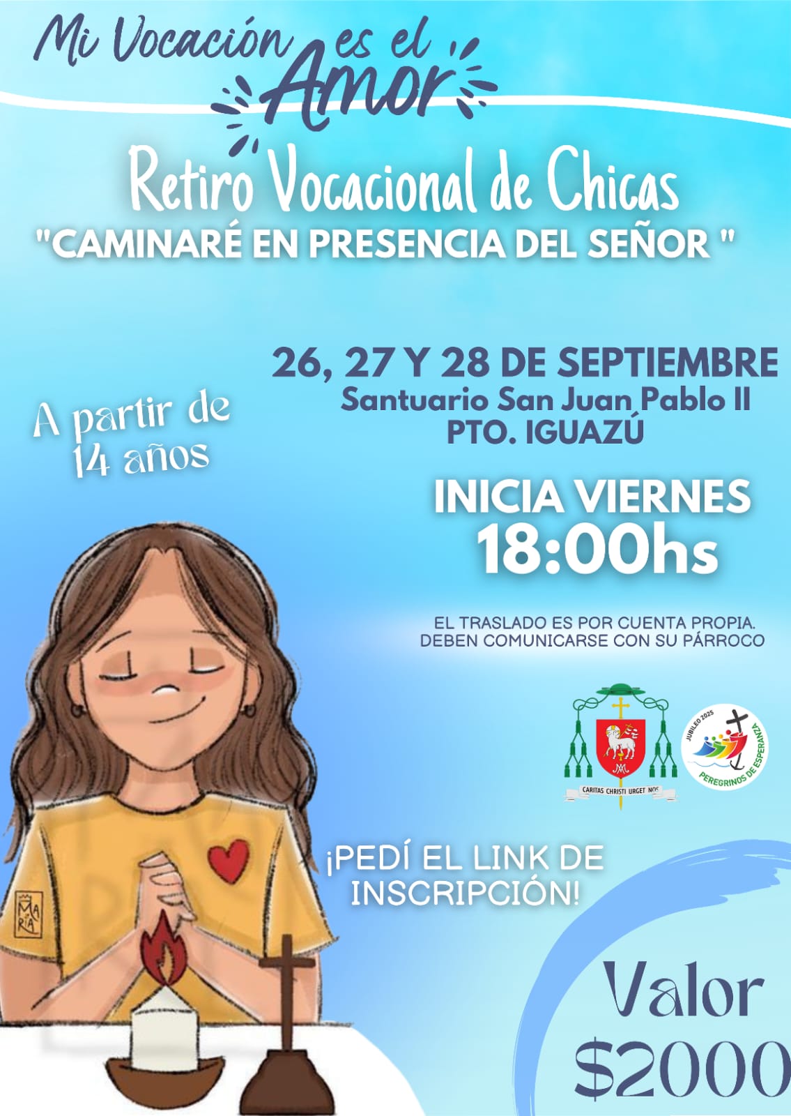 Bajo el lema “Caminaré en presencia del Señor”, del 26 al 28 de septiembre se llevará adelante un retiro vocacional destinado a chicas a partir de los 14 años, en el Santuario San Juan Pablo II de Puerto Iguazú.