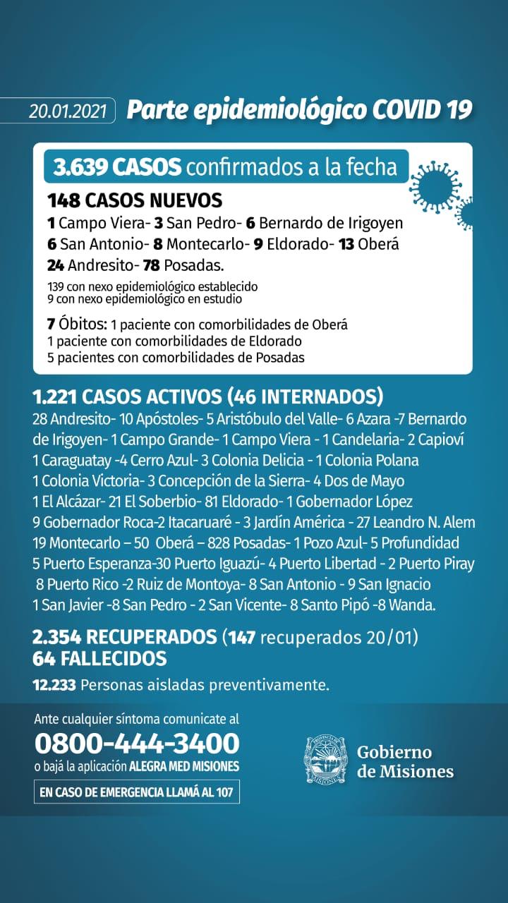 El Ministerio de Salud Pública de Misiones informó este miércoles 148 nuevos contagios y 7 fallecimientos por coronavirus.