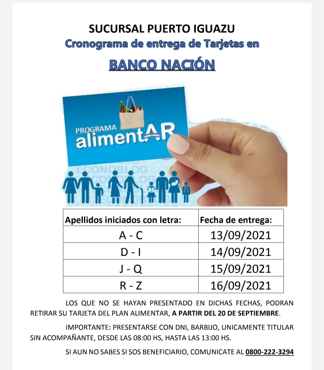Banco Nación, sucursal Puerto Iguazú, presenta el cronograma de entrega de Tarjetas del Plan Alimentar.