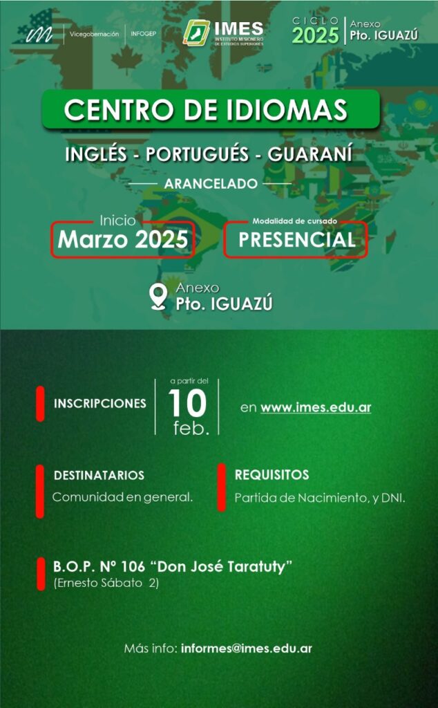 El Centro de Idiomas del Instituto Misionero de Estudios Superiores (IMES), ubicado en BOP 106, María Mercedes García Taratuty, inicia sus clases en este 2025. Según explicó el licenciado Hugo López, coordinador del centro, se dictarán cursos de inglés, portugués y guaraní pensados especialmente para quienes trabajan y disponen de poco tiempo.