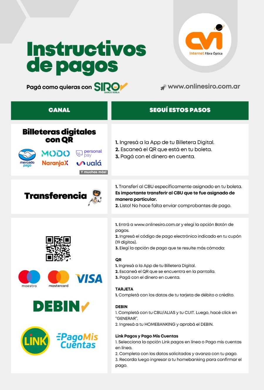 La empresa CVI informa que a partir de este mes comenzó a implementarse el nuevo sistema de cobranza SIRO, que permitirá a los usuarios abonar sus facturas de manera más ágil, segura y personalizada.