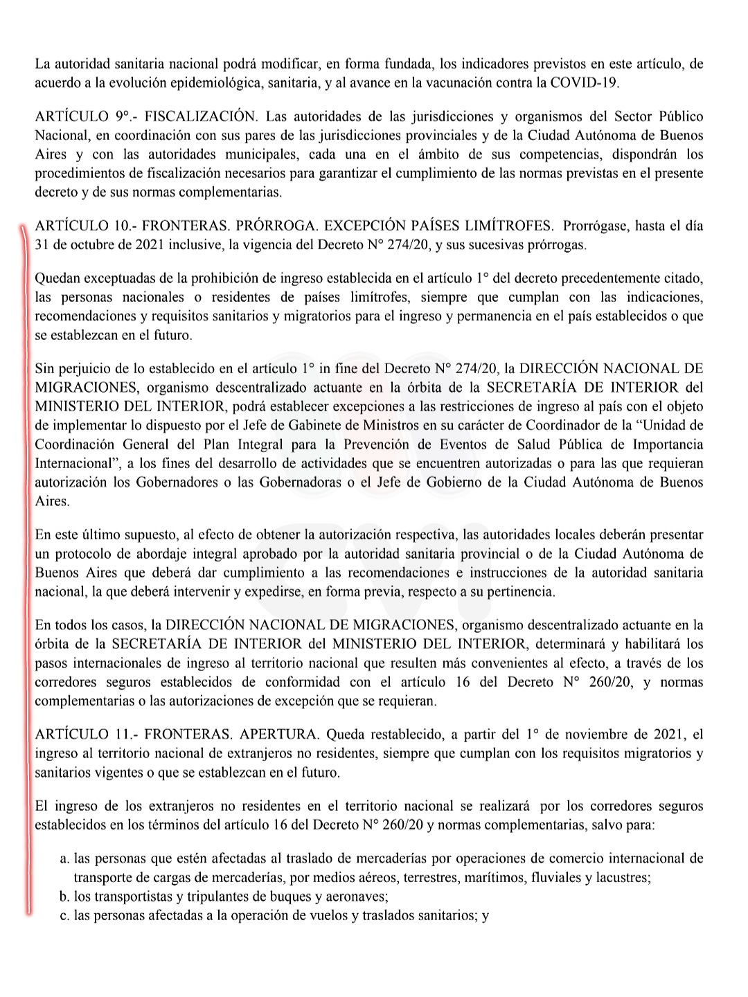A partir del 1 de noviembre de 2021, se restablece el ingreso al territorio nacional de extranjeros no residentes, siempre que cumplan con los requisitos migratorios y sanitarios vigentes o que se establezcan en el futuro. El mismo se realizará por los corredores seguros establecidos en los términos del artículo 16 del Decreto N° 260/20