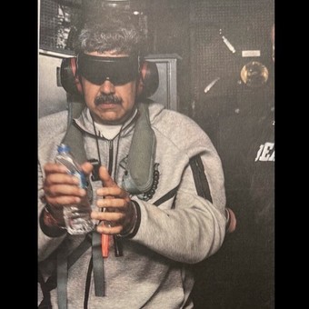 En la imagen publicada por Trump se observa al dictador venezolano vestido con ropas deportivas, unas grandes anteojeras negras, y una pequeña botella de agua mineral en sus manos. Esposado, lleva puestos unos grandes auriculares.