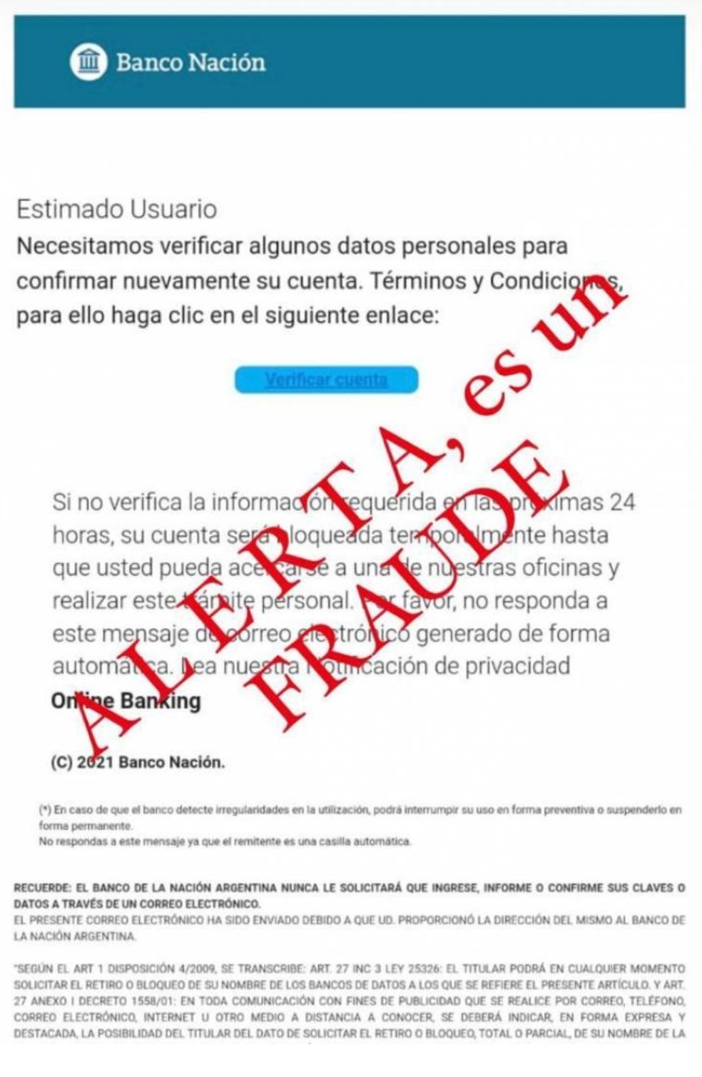 Sergio Resumil, vocero de la entidad, confirmó que existió «un intento de fraude cibernético masivo con envío de emails o whtasapp con una cuenta falsa del Banco Nación».