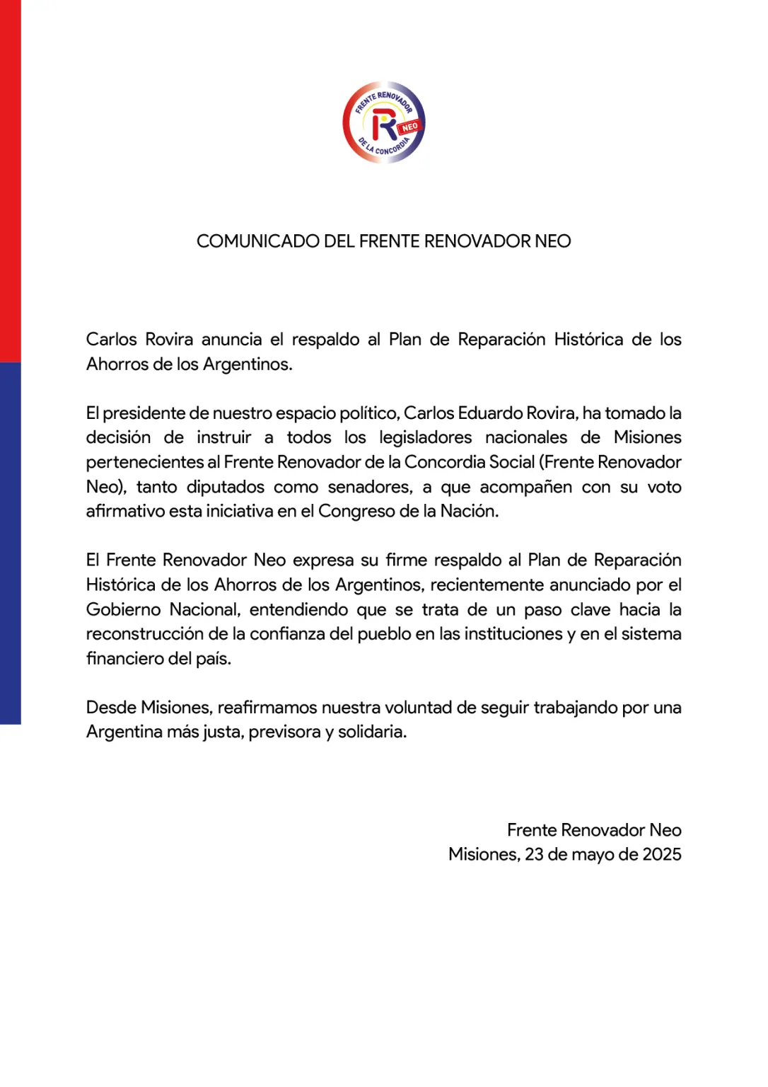Desde Misiones, el Frente Renovador de la Concordia Social —también conocido como Frente Renovador Neo— expresó su respaldo al Plan de Reparación Histórica de los Ahorros de los Argentinos, impulsado recientemente por el Gobierno Nacional.
