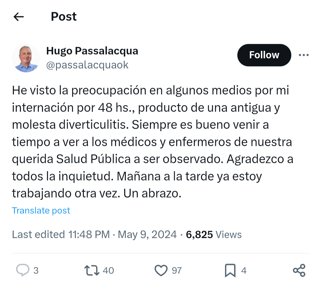 “Siempre es bueno venir a tiempo a ver a los médicos y enfermeros de nuestra querida Salud Pública a ser observado”, publicó en X Passalacqua.En el mismo mensaje, agradeció a los misioneros por la inquietud y preocupación. “Mañana (hoy viernes) a la tarde ya estoy trabajando otra vez”, expresó.