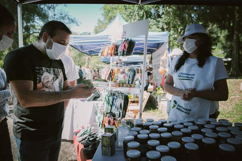 Herrera Ahuad, junto al Intendente de Garuhapé, Carlos Gerardo Schmied; la Ministra de Agricultura Familiar, Marta Ferreira y el diputado provincial Martín Cesino, recorrió el lugar donde se desarrolla la actividad y la comercialización de frutas, verduras y envasados de los productores independientes de la agricultura familiar.