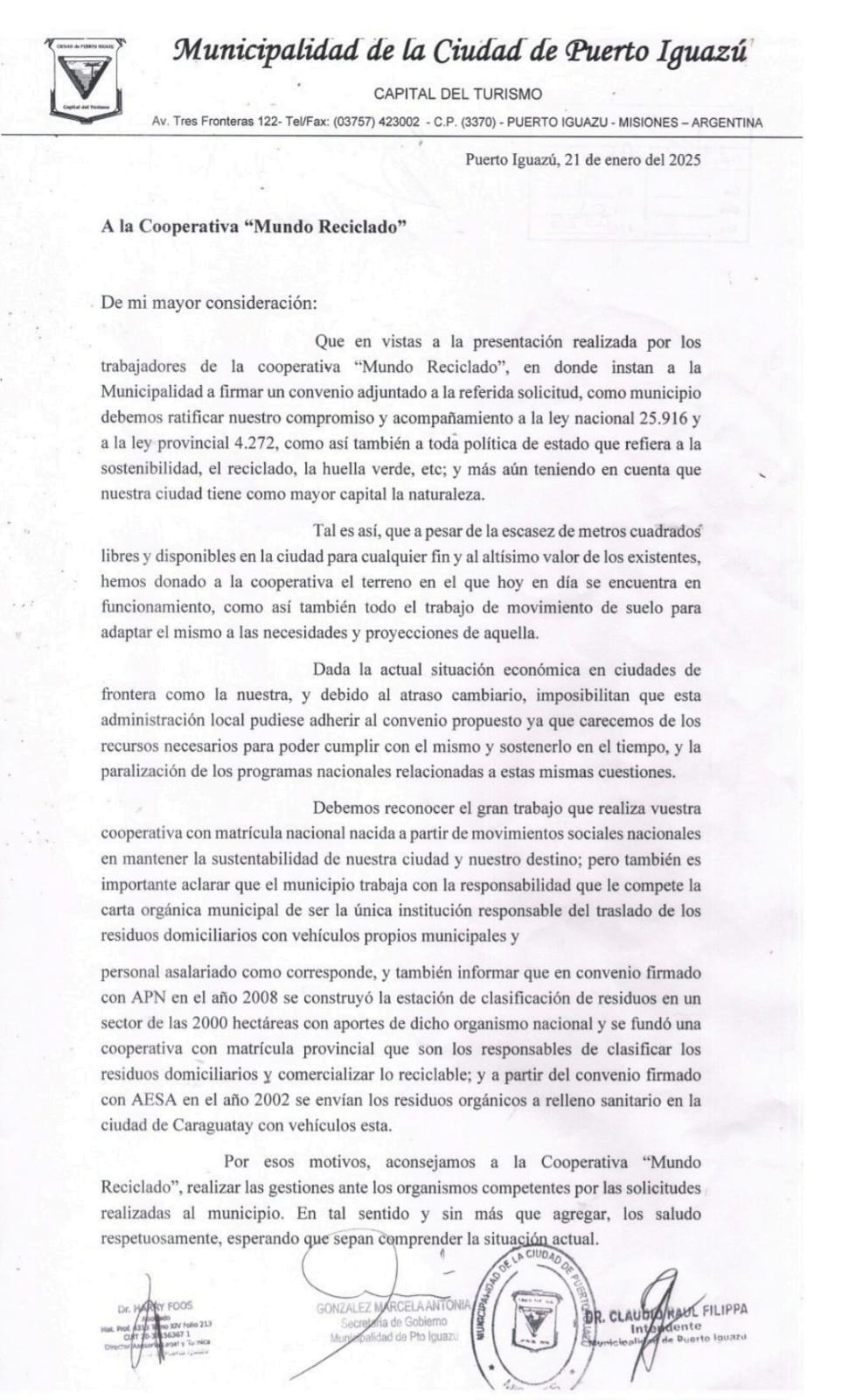 En el marco de un reclamo presentado por la cooperativa “Mundo Reciclado”, parte del Movimiento de Trabajadores Excluidos (MTE), la Municipalidad de Puerto Iguazú respondió que los pedidos realizados, que incluyen recursos como agua, luz, un camión y combustible, exceden las competencias locales y deberían gestionarse ante organismos nacionales.