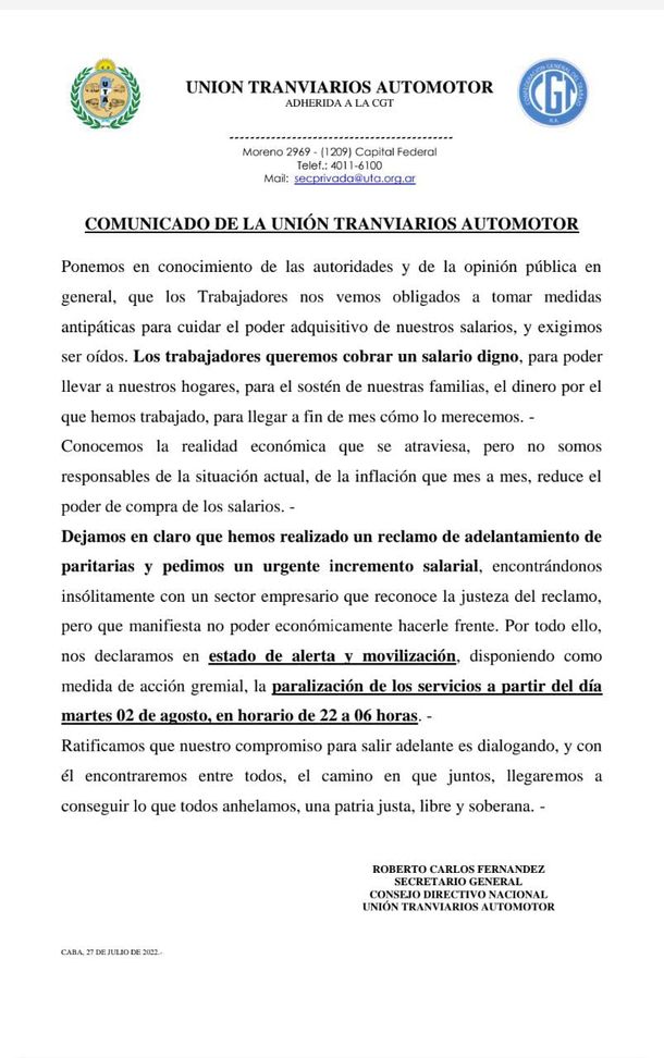 La Unión Tranviarios Automotor (UTA) anunció hoy que el martes que viene realizará un paro de colectivos nacional ante la negativa de las empresas de otorgar a los trabajadores un bono de 25.000 pesos.