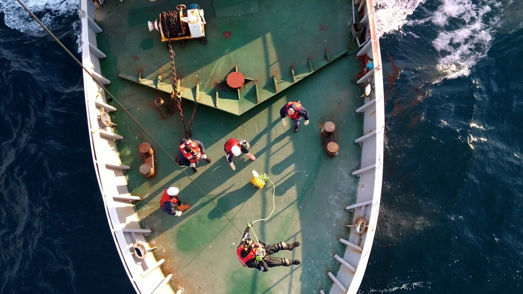 Una vez sobre el buque, se descendió una canasta sanitaria e izó al tripulante, en una milimétrica maniobra.