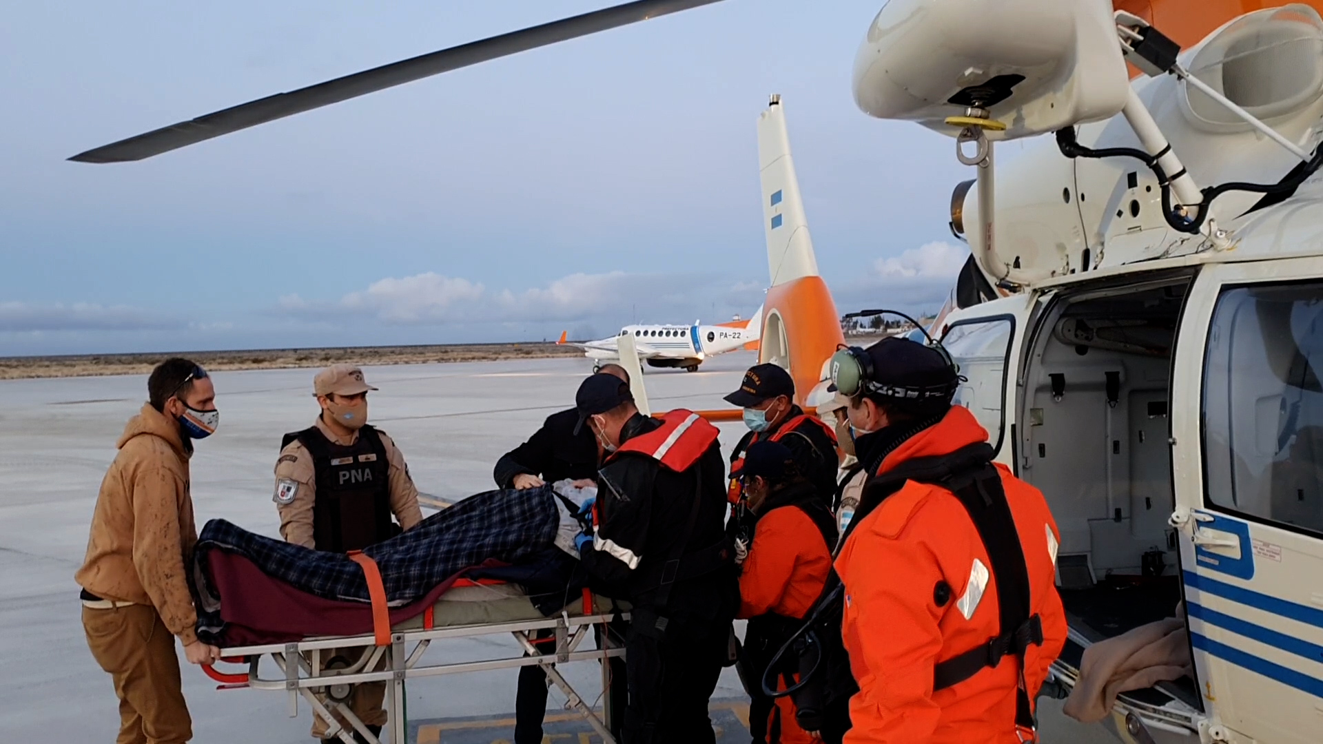 Rápidamente, desde la Estación Aérea de Comodoro Rivadavia, decoló hacia el lugar un avión y helicóptero de la Prefectura, con personal especializado para asistir este tipo de emergencias.