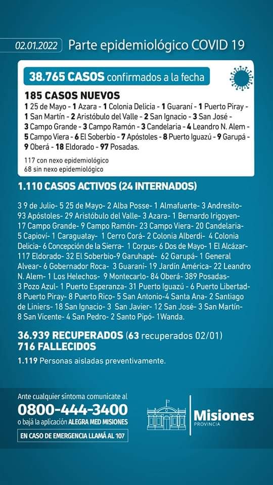 De esta manera, Misiones registra a la fecha un total de 38.765 infectados y 716 fallecidos por la enfermedad.