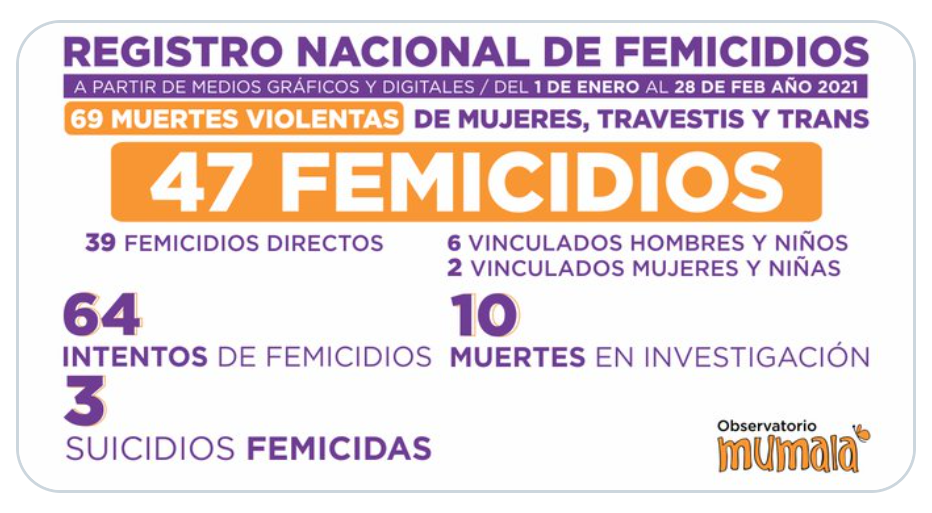 Un total de 47 femicidios, entre ellos ocho vinculados, y 64 intentos, fueron cometidos en los dos primeros meses de 2021, lo que equivale a una mujer asesinada cada 30 horas, informó la organización MuMalá-Mujeres de la Matria Latinoamericana.