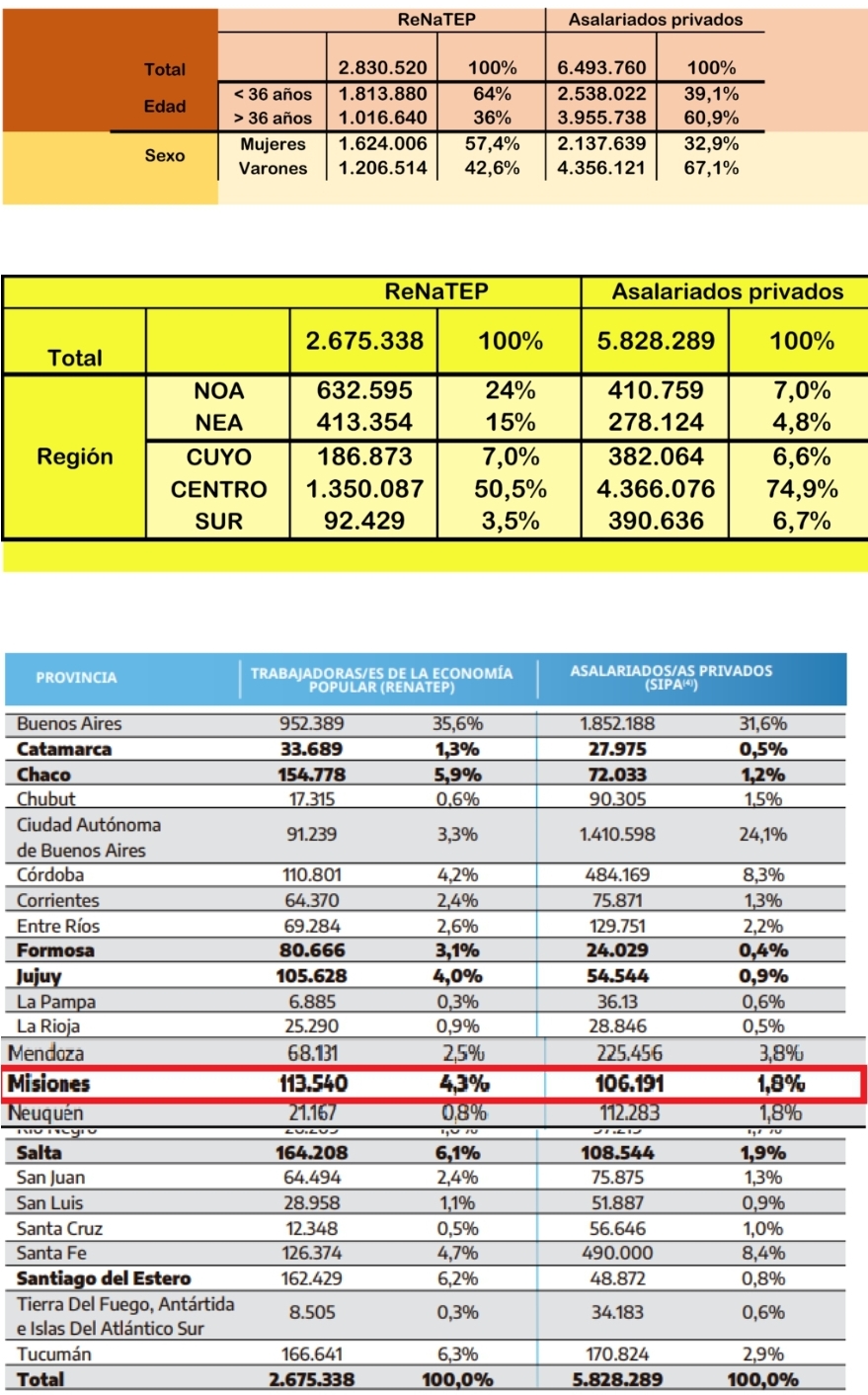 Un informe del Ministerio de Desarrollo Social de la Nación, presentado el pasado 30 de agosto por el ministro Juan Zabaleta en Villa Lugano, detalló que Misiones tiene registrados 113.540 trabajadores y trabajadoras de la Economía Popular, y sólo 106.191 personas empleadas asalariadas en el sector privado.