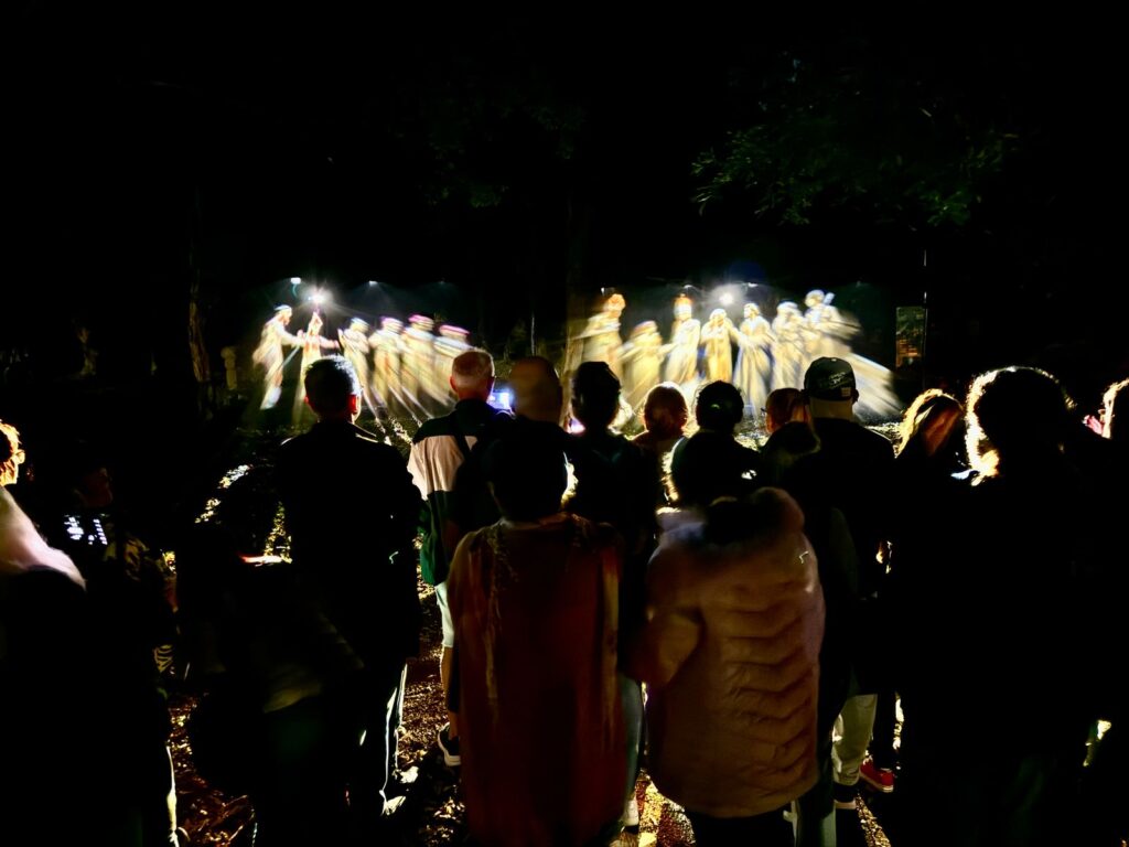 Durante 45 minutos, la historia cobra vida en medio de la naturaleza, con el cielo despejado y la luna acompañando el recorrido, mientras las imágenes se funden con el relato del cacique que guía a los visitantes.