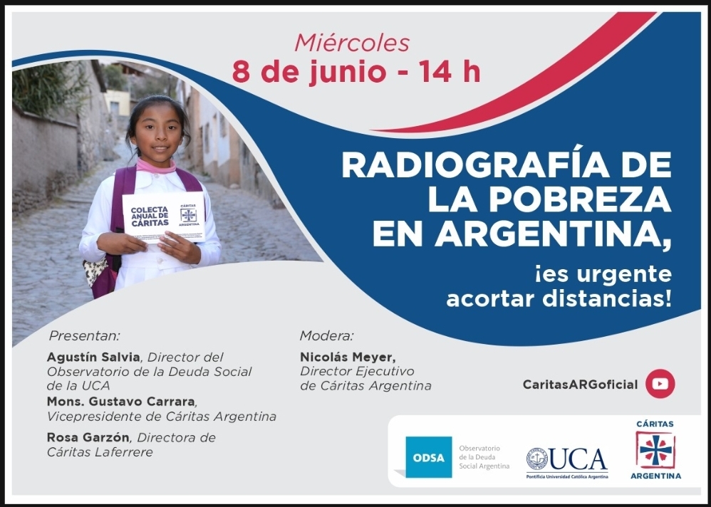 En el marco de la Colecta Anual que se realizará el próximo fin de semana, Cáritas Argentina y el Observatorio de la Deuda Social de la Universidad Católica Argentina (ODSA) lo invitan a participar, el miércoles 8 de junio a las 14, de la presentación del informe “Radiografía de la pobreza en Argentina, ¡es urgente acortar distancias!”, en el que se expondrá un profundo análisis sobre la grave situación social que atraviesa el país y las acciones que se llevan adelante para dar respuesta a las múltiples realidades de pobreza.