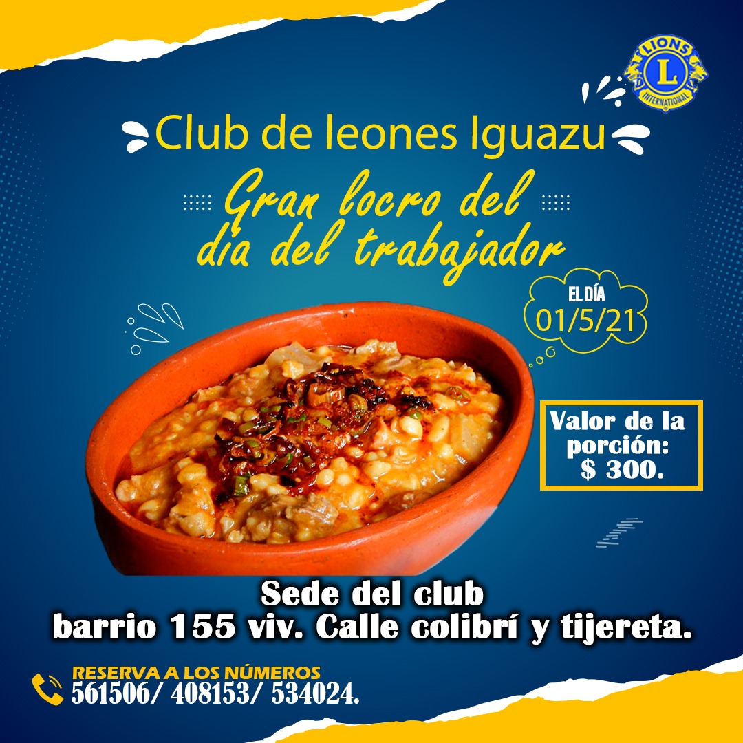 El Club de Leones Iguazú, está organizando la venta de locro, a $300 la porción, para este sábado 01 de Mayo – Día del Trabajador – en su sede ubicada en las 155 viviendas, calle Colibrí y Tijereta.