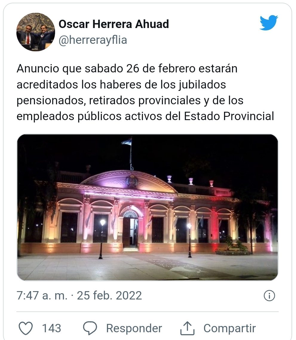 “Anuncio que el sabado 26 de febrero estarán acreditados los haberes de los jubilados pensionados, retirados provinciales y de los empleados públicos activos del Estado Provincial”, reza el comunicado emitido por el titular del Poder Ejecutivo.