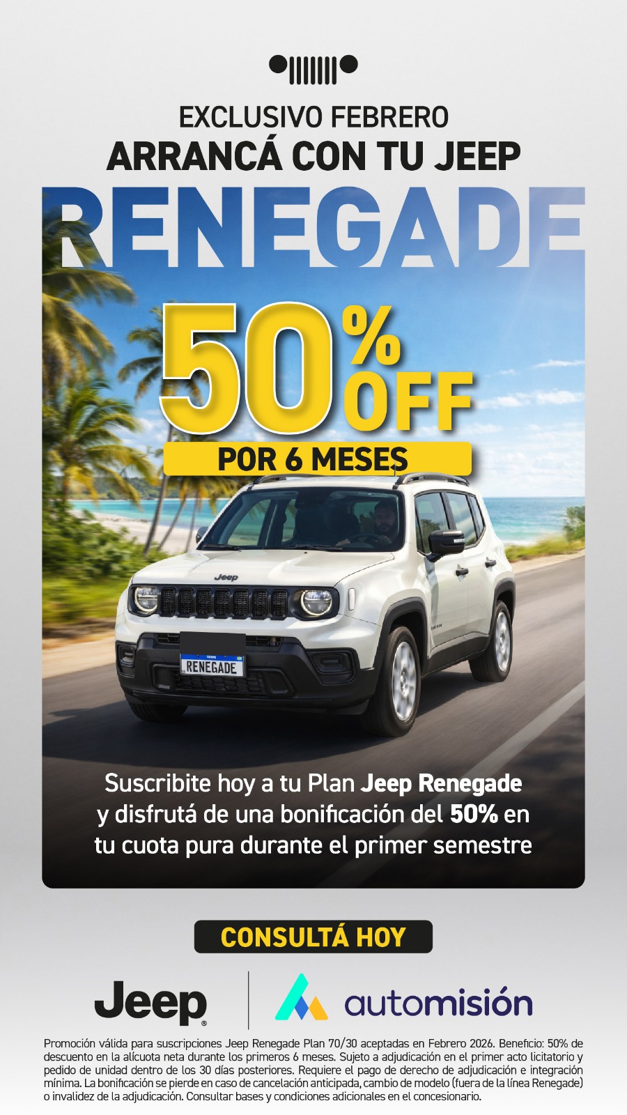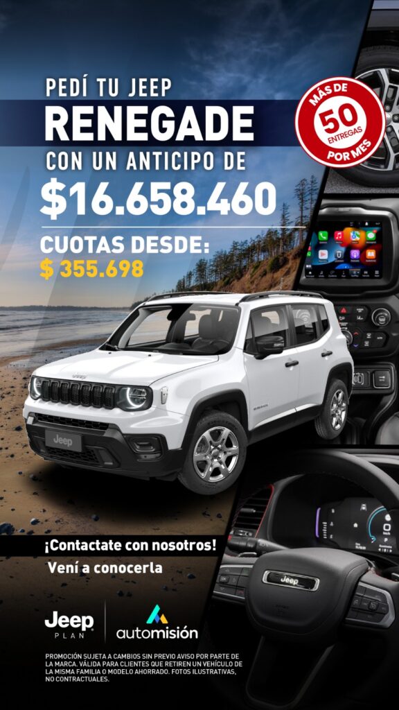 El cronos, el más vendido con tan solo el 20% que serían unos $ 7.442.000 ya lo adjudicas en cuota 2, además te bonificamos x 6 meses la cuota al 50%, pagarías la mitad de la cuota, si te gusta la Jeep Renegade, también podés adjudicar en cuota 2 y tenés 6 meses de cuota bonificada al 50%.