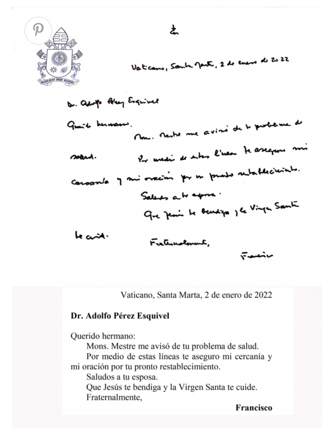 «Querido hermano: Mons. Mestre me avisó de tu problema de salud. Por medio de estas líneas te aseguro mi cercanía y mi oración por tu pronto restablecimiento. Saludos a tu esposa. Que Jesús te bendiga y la Virgen Santa te cuide. Fraternalmente», expresó Francisco en un mensaje manuscrito.