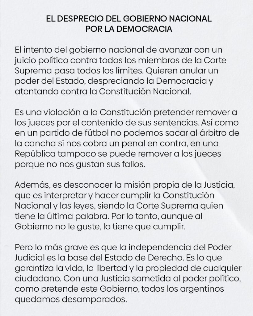 El desprecio del Gobierno Nacional por la democracia. El intento del gobierno nacional de avanzar con un juicio político contra todos los miembros de la Corte Suprema pasa todos los límites. Quieren anular un poder del Estado, despreciando la Democracia y atentando contra la Constitución Nacional.