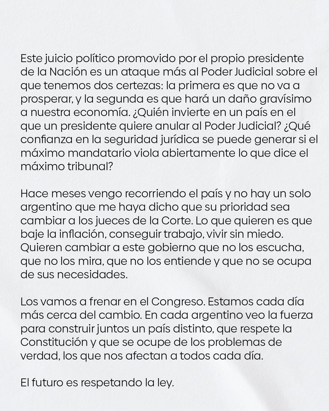 Los vamos a frenar en el Congreso. Estamos cada día más cerca del cambio. En cada argentino veo la fuerza para construir juntos un país distinto, que respete la Constitución y que se ocupe de los problemas de verdad, los que nos afectan a todos cada día.