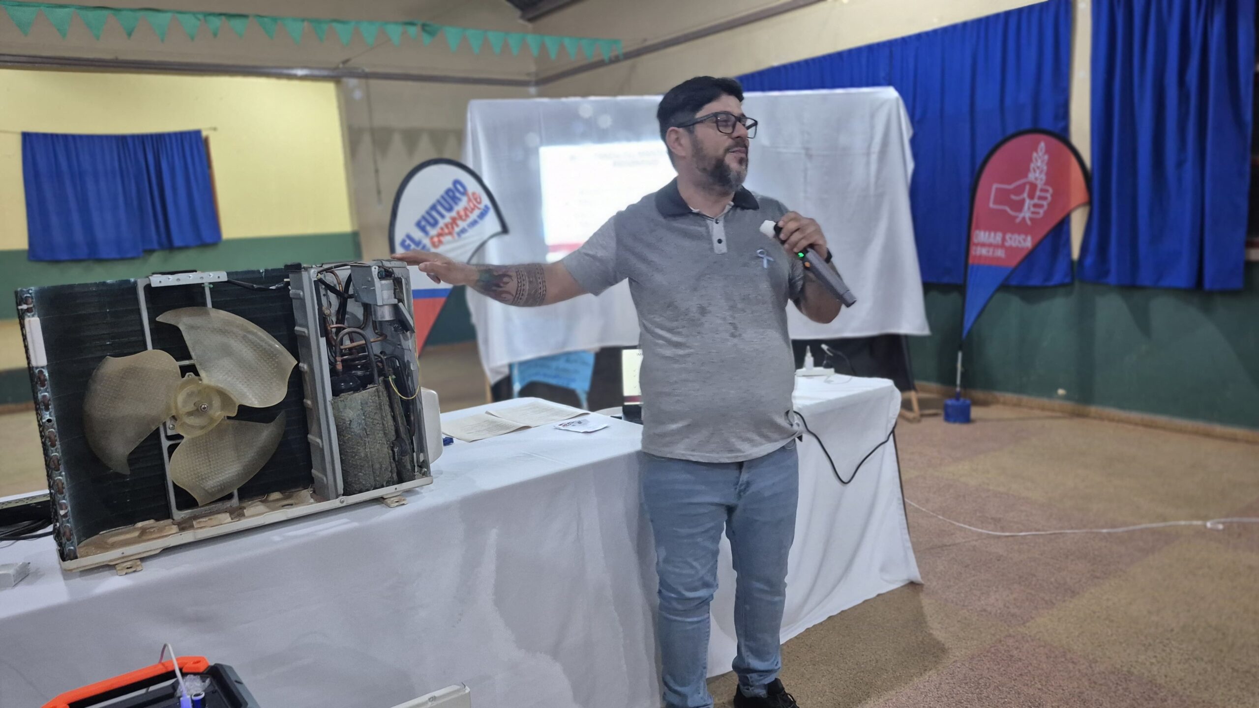 El evento, que comenzó a las 19:00 hs, reunió a decenas de vecinos y vecinas interesados en adquirir conocimientos prácticos sobre el mantenimiento de estos equipos fundamentales, especialmente de cara a los meses de altas temperaturas. La capacitación estuvo a cargo del Técnico Guillermo Martínez, quien brindó herramientas útiles tanto para el ahorro doméstico como para emprender un oficio con salida laboral.