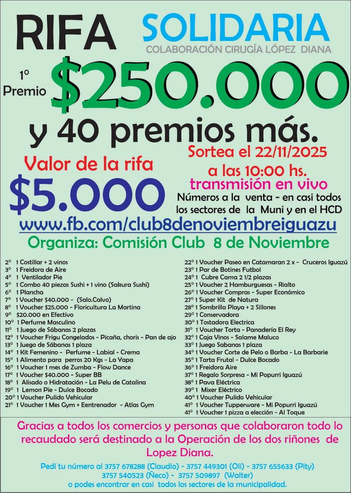 La comunidad de Iguazú se encuentra en la recta final de una importante convocatoria solidaria. La comisión del Club 8 de Noviembre está organizando una rifa solidaria con el objetivo de recaudar fondos esenciales por la salud de Diana López, quien atraviesa serias complicaciones en el funcionamiento de sus riñones.