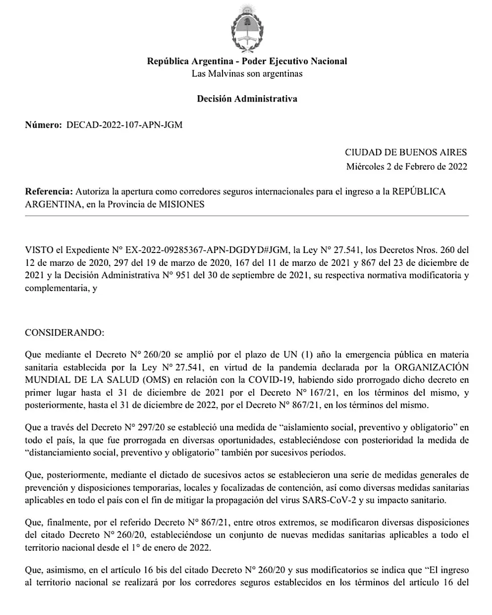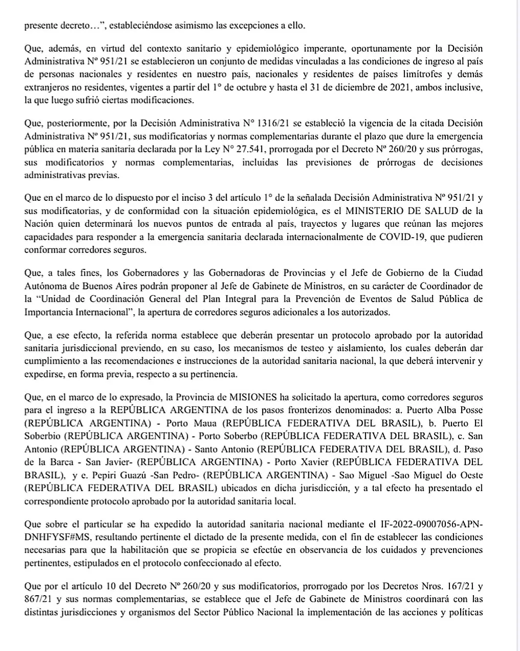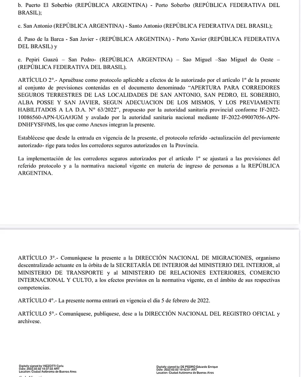 La resolución del gobierno nacional con fecha de este miércoles, se habilitan los pasos Alba Posse- Puerto Maua, El Soberbio- Porto Soberbo, San Antonio con Santo Antonio y San Pedro con Sao Miguel do Oeste, y además queda habilitado el paso de la balsa entre San Javier- Porto Xavier.