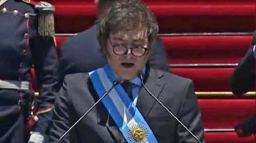 Tras jurar como presidente, el nuevo jefe de Estado, pronunció un discurso en un escenario dispuesto frente al Congreso. Dijo que «no hay una alternativa al ajuste, ni al shock»; y reiteró: «No hay plata»