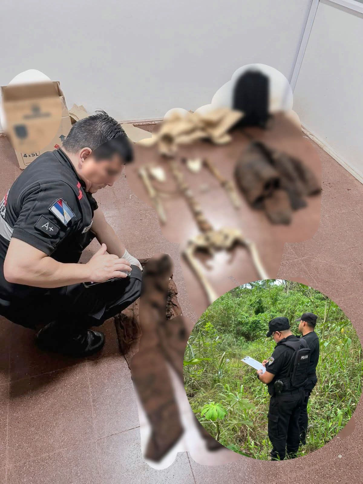 En el lugar intervino personal de Policía Científica, que realizó el relevamiento correspondiente y constató la presencia de aproximadamente 34 restos óseos, entre ellos cráneo, vértebras y piezas de miembros superiores e inferiores.