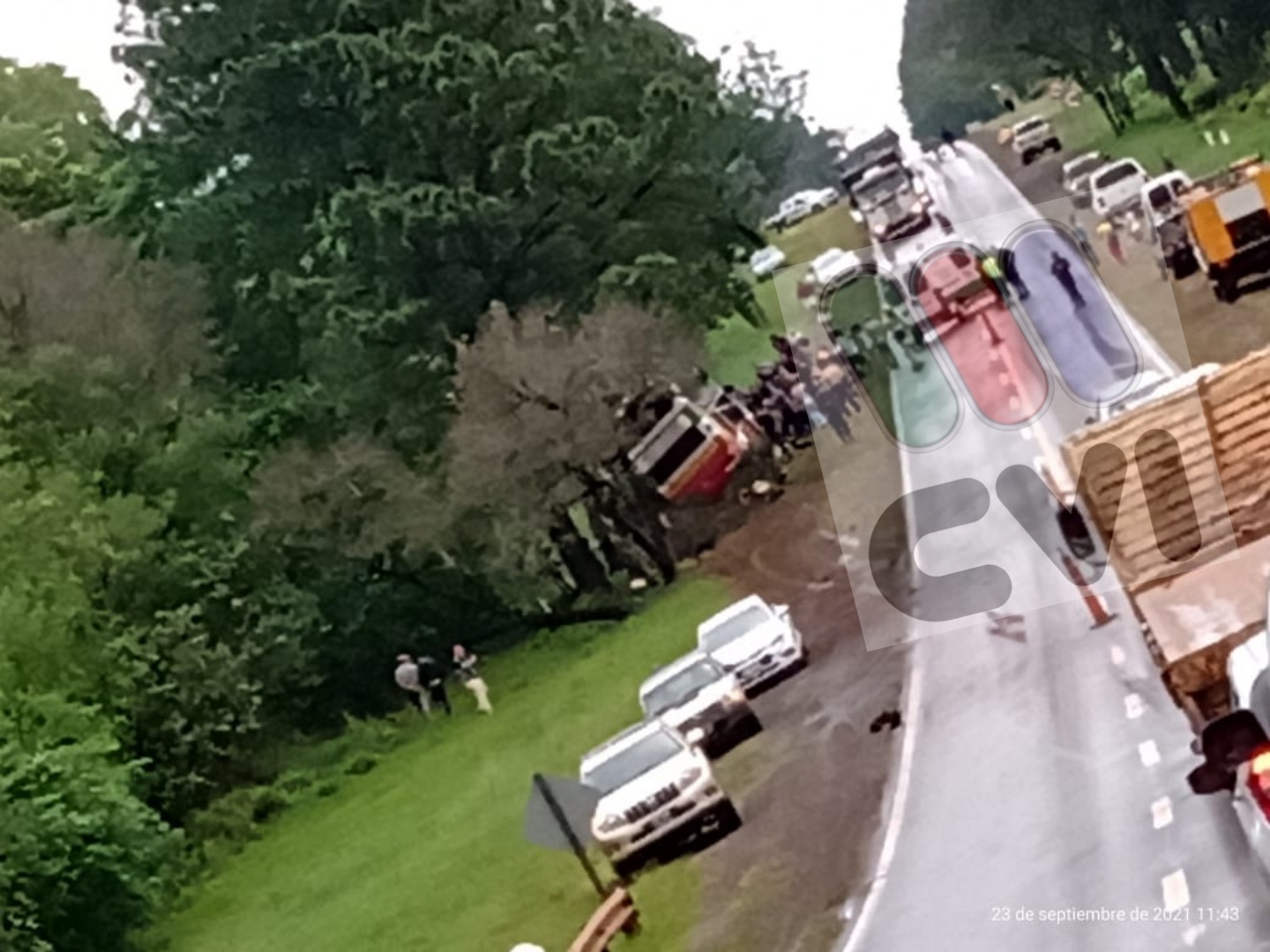 El siniestro vial ocurrió aproximadamente a las 11:30 horas de este jueves, en el kilómetro 1406 de la ruta 12 donde según los primeros datos obtenidos, un colectivo de media distancia que circulaba en sentido Iguazú-Posadas con 25 pasajeros, sufrió la explosión de un neumático, despistó al carril contrario, colisionó con un auto Fiat Qubo y terminó en la banquina impactando con árboles de pino.