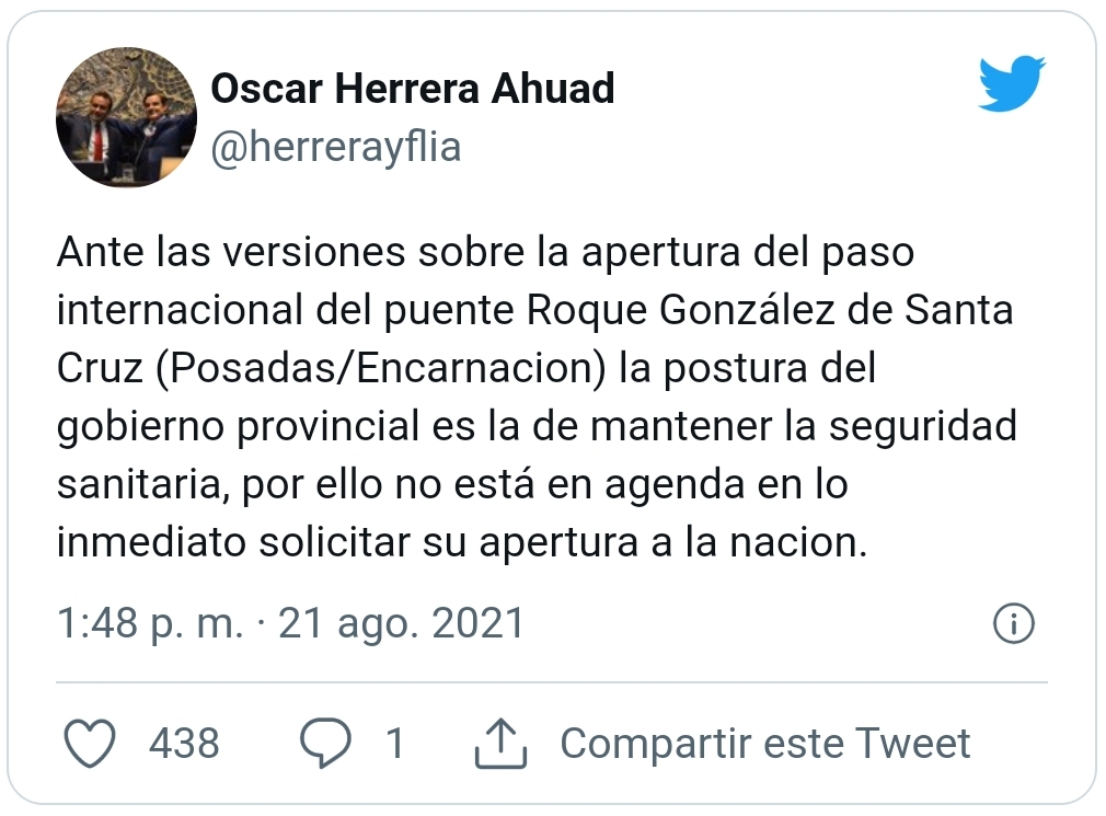 “Ante las versiones sobre la apertura del Paso Internacional del puente San Roque González de Santa Cruz (Posadas/Encarnación) la postura del Gobierno provincial es la de mantener la seguridad sanitaria, por ello no está en agenda en lo inmediato solicitar su apertura a la Nación”, aclaró el Gobernador en su cuenta personal de Twitter.