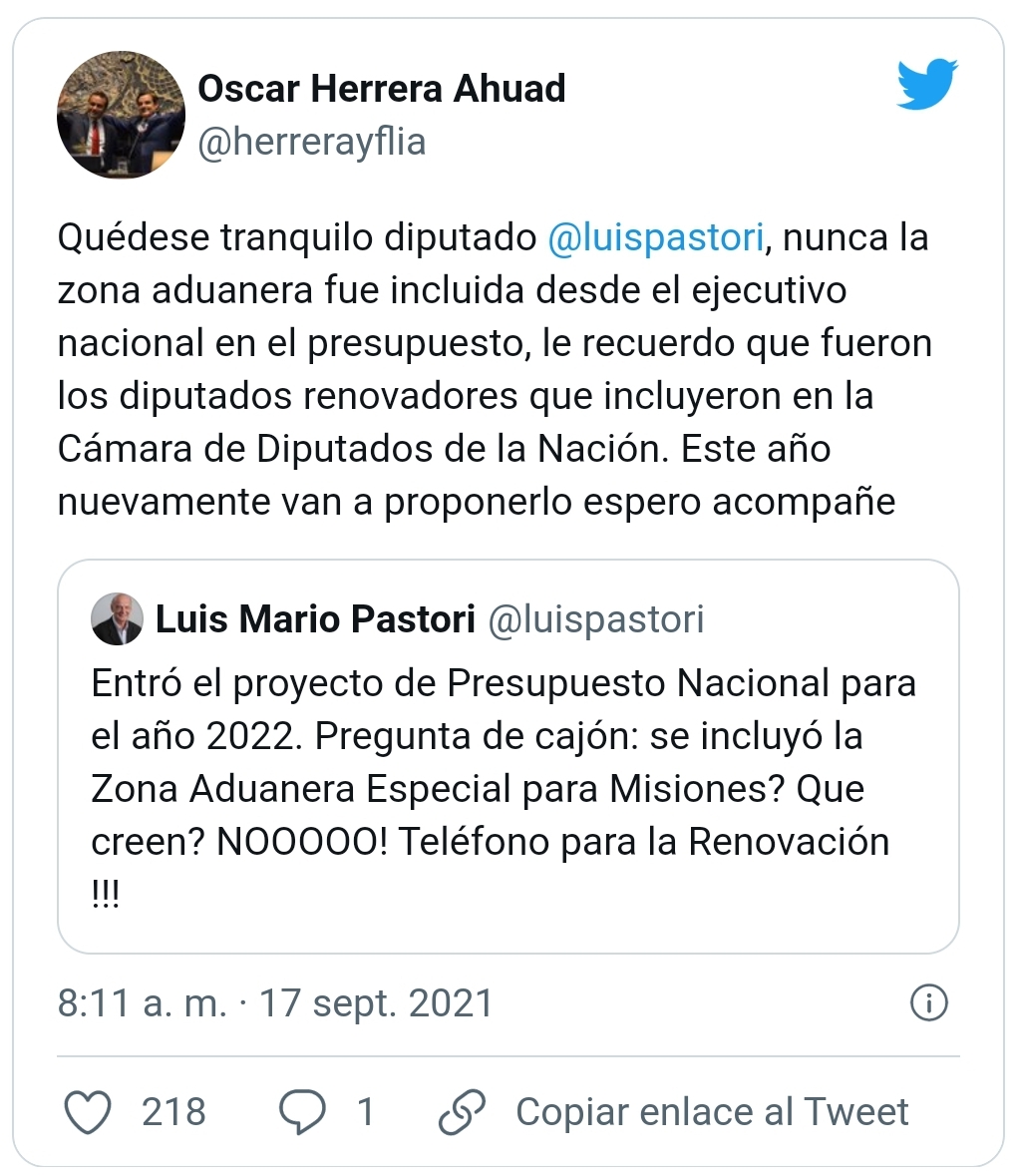 Enseguida recibió la respuesta del Gobernador: “Quédese tranquilo diputado @luispastori, nunca la Zona Aduanera fue incluida desde el Ejecutivo Nacional en el presupuesto, le recuerdo que fueron los diputados renovadores que incluyeron en la Cámara de Diputados de la Nación. Este año nuevamente van a proponerlo, espero acompañe”.