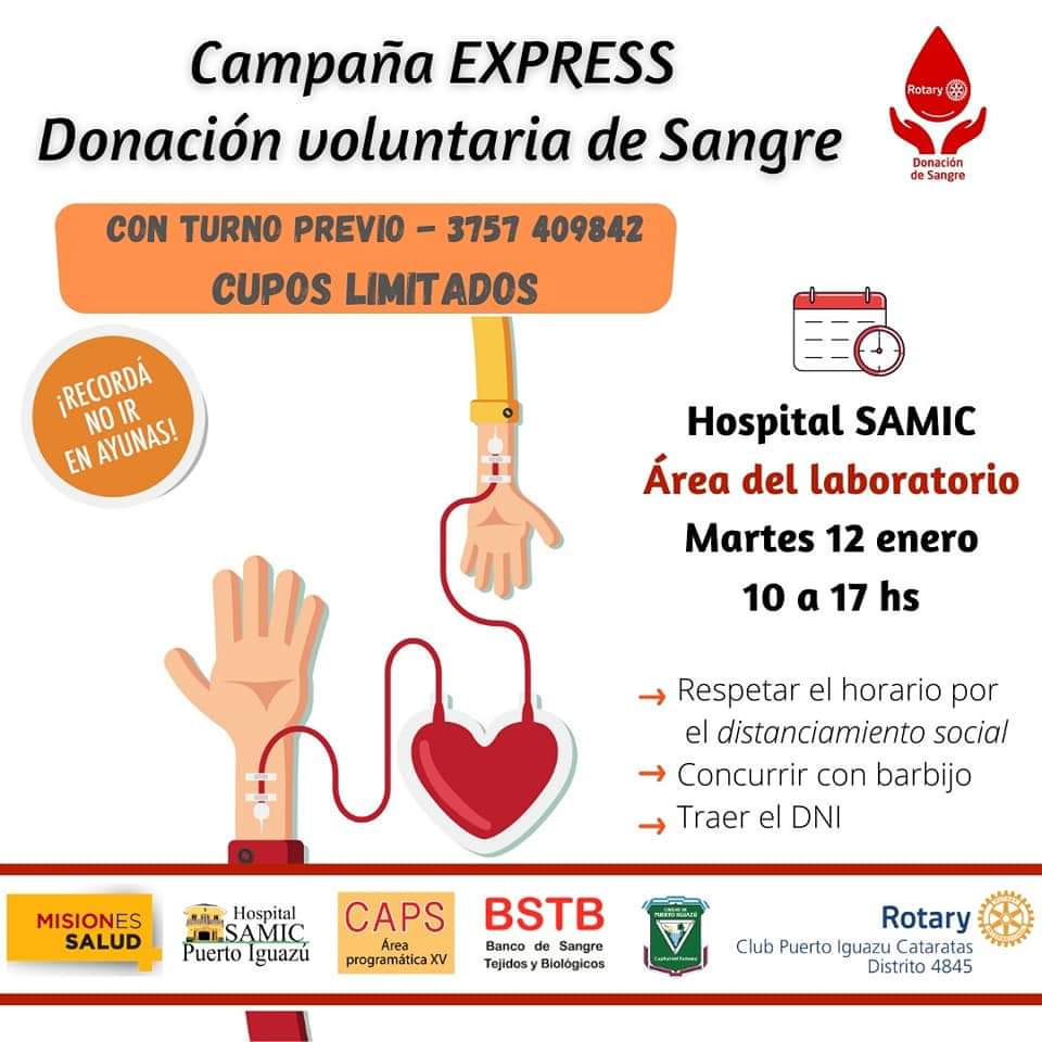 Para esta jornada “Express”, es muy importante solicitar turno ya que los mismos son limitados, y programamos la participación de los donantes respetando el distanciamiento social. Les recordamos que todos deben venir con el tapa boca / barbijo.