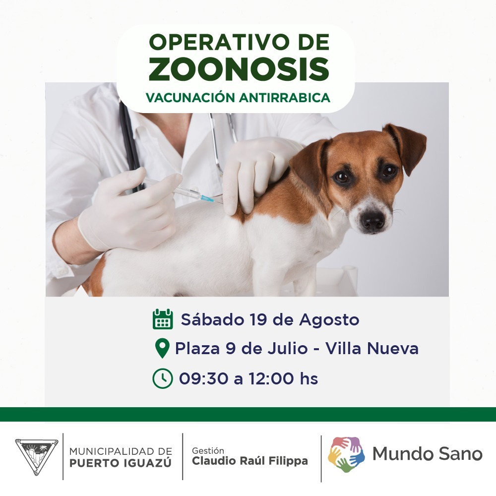 Se realizará una jornada gratuita de vacunación antirrábica para animales domésticos el sábado 19 de agosto de 9:30 a 12 hs, en la Plaza 9 de Julio del Barrio Villa Nueva.