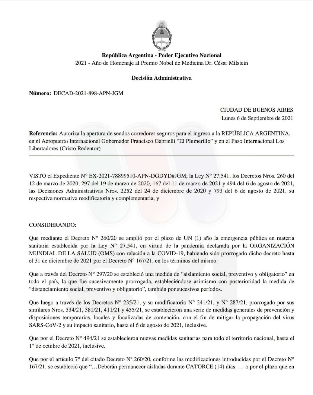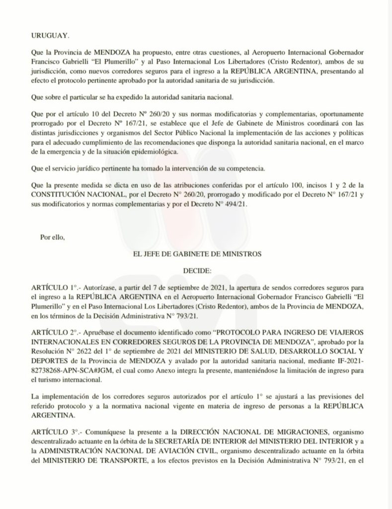 El Gobierno autorizó la apertura de sendos corredores seguros para el ingreso a la República Argentina al Aeropuerto Internacional Gobernador Francisco Gabrielli «El Plumerillo» y el Paso Internacional «Los Libertadores» ( Cristo Redentor) ambos de la ciudad de Mendoza.