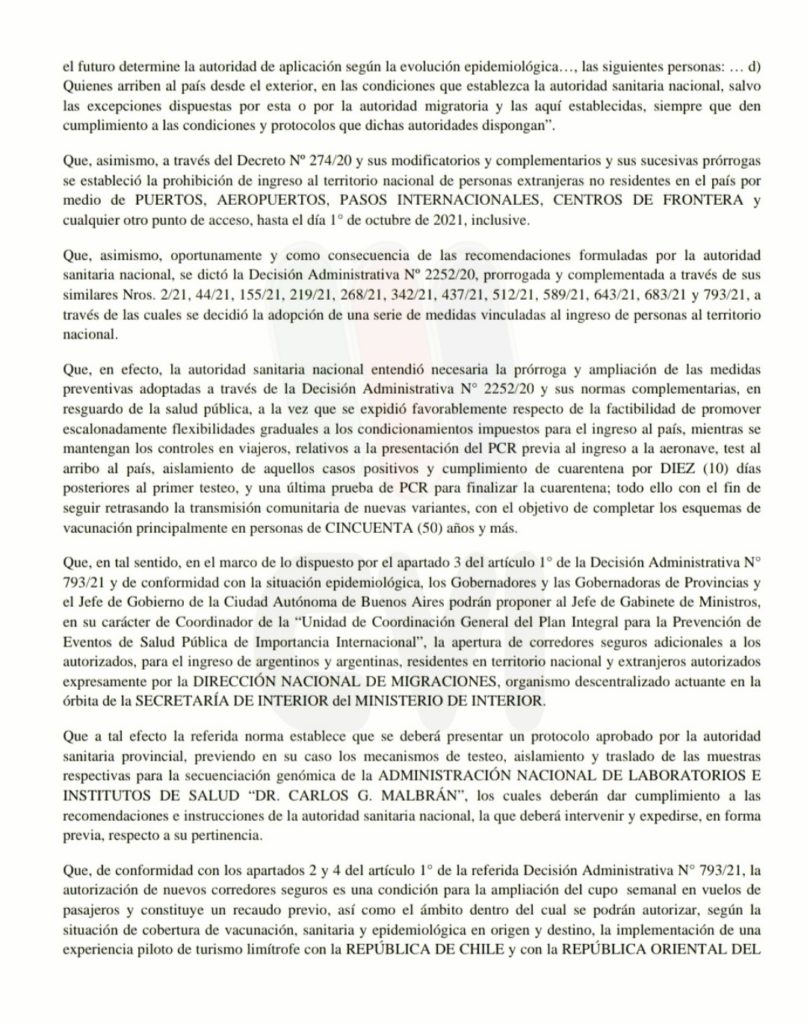 La autorización de nuevos corredores seguros es una condición para la ampliación del cupo semanal en vuelos de pasajeros y constituye un recaudo previo, así como el ámbito dentro del cual se podrán autorizar, según la situación de cobertura de vacunación, sanitaria y epidemiológica en origen y destino, la implementación de una experiencia piloto de turismo limítrofe con la República de Chile y con la República Oriental del Uruguay.