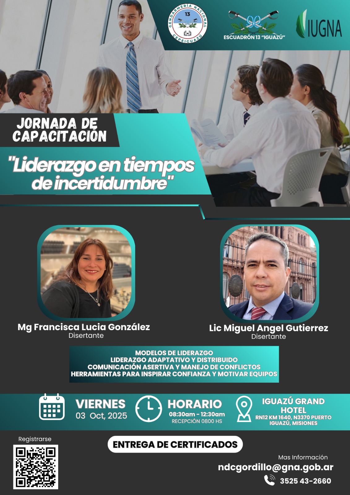 Se realizará una importante jornada de capacitación titulada “Liderazgo en tiempos de incertidumbre”, organizada por el Escuadrón 13 de Gendarmería Nacional. La actividad se llevará a cabo el viernes 3 de octubre en las instalaciones del Iguazú Grand Hotel, desde las 8:30 hasta las 12:30 horas, con recepción prevista a partir de las 8:00.