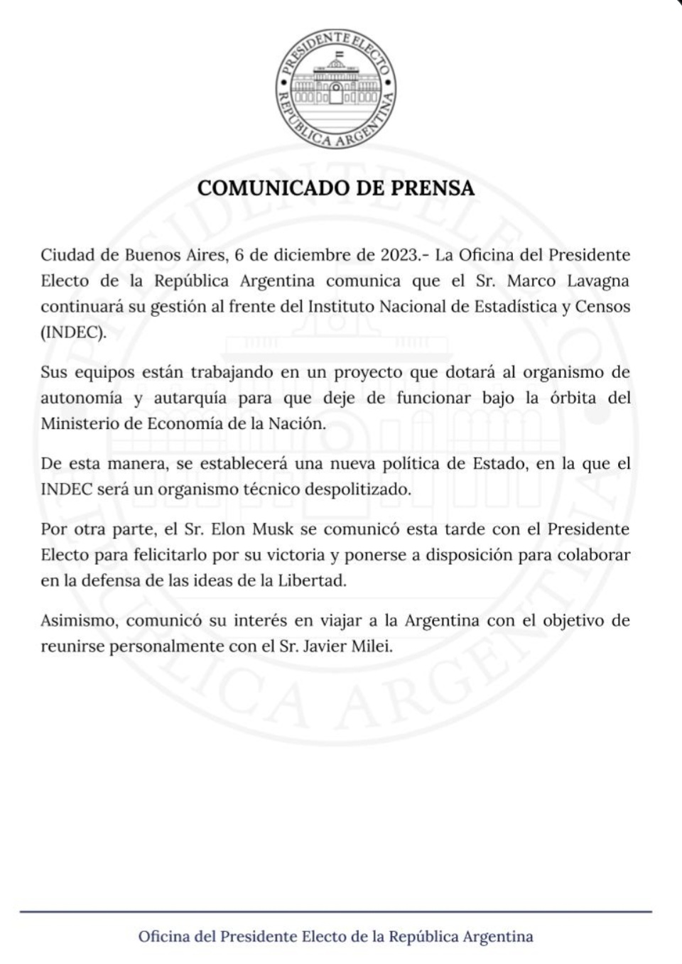 se confirmó a Lavagna como director del Indec, el equipo del Presidente Electo informó que el empresario multimillonario Elon Musk se comunicó en la tarde de hoy con Javier Milei para felicitarlo por su victoria y para ponerse a disposición, con el fin de colaborar en la defensa de las ideas de la Libertad.