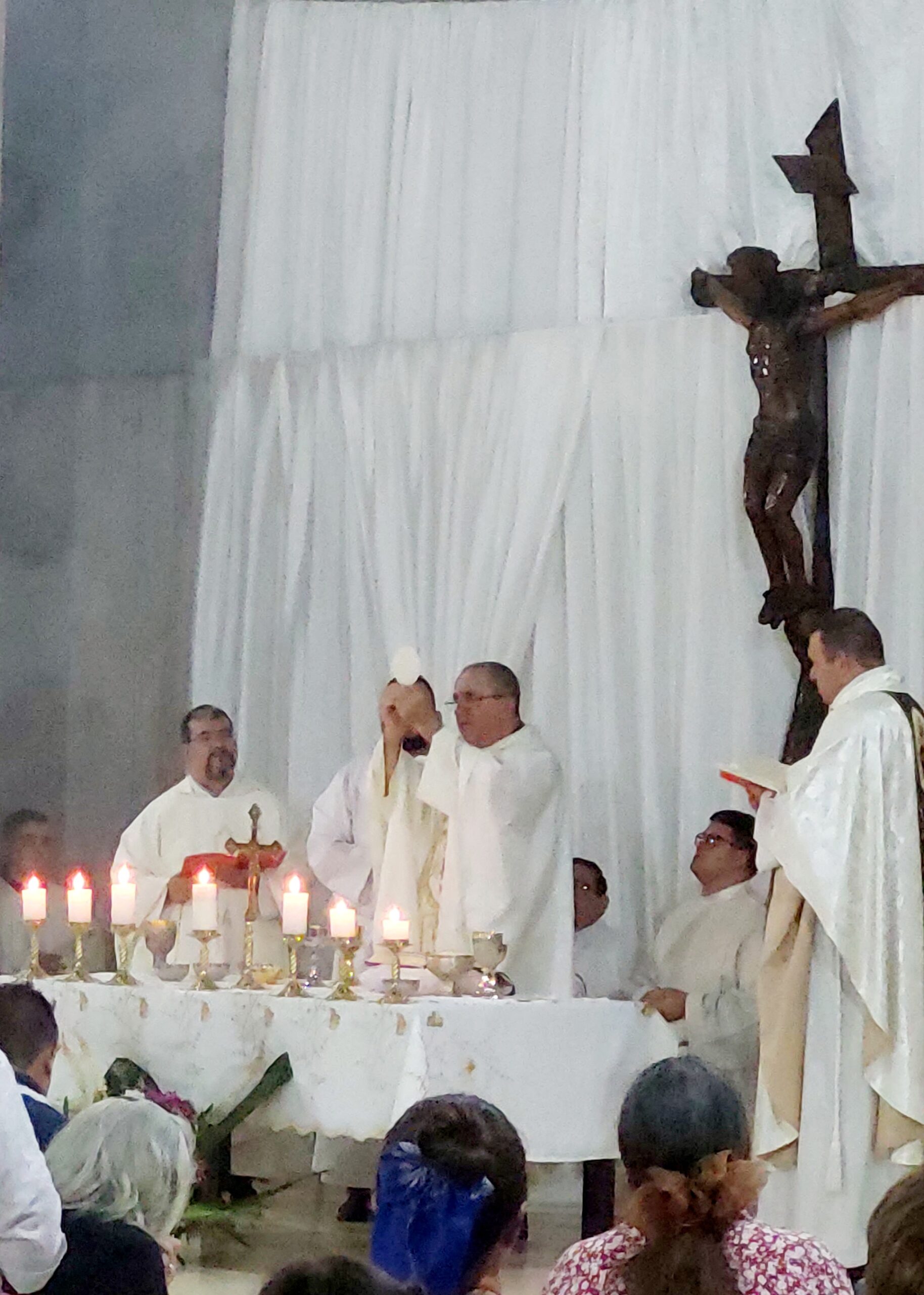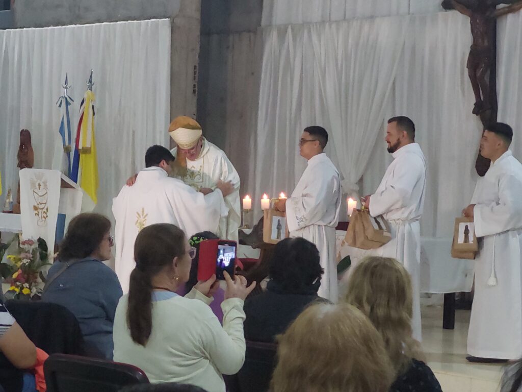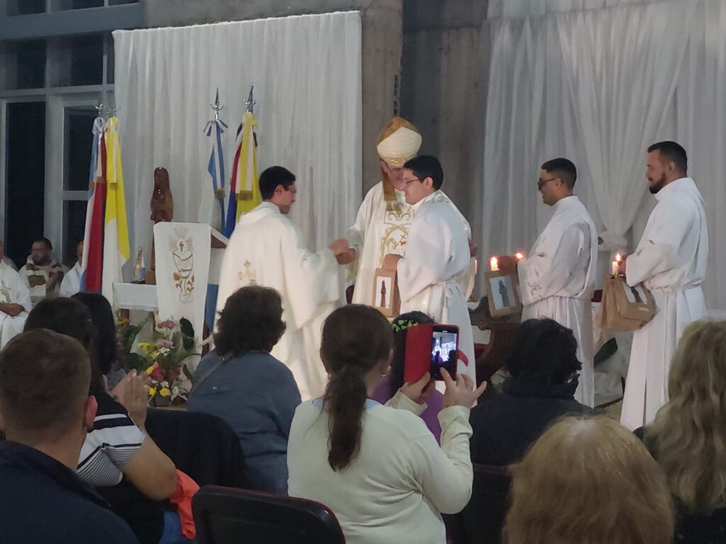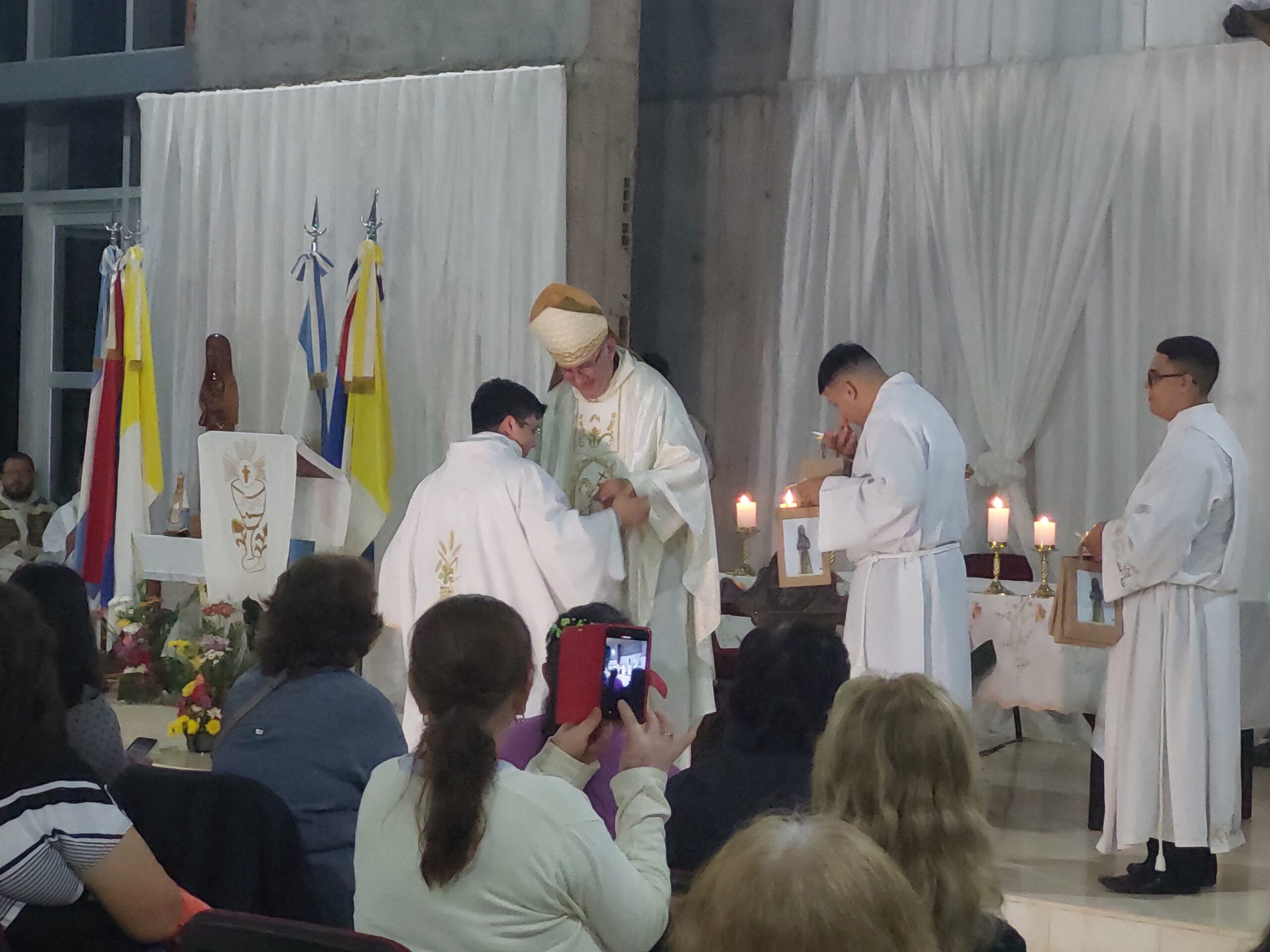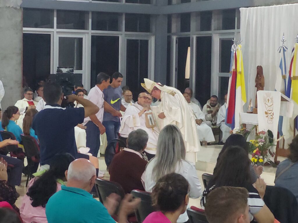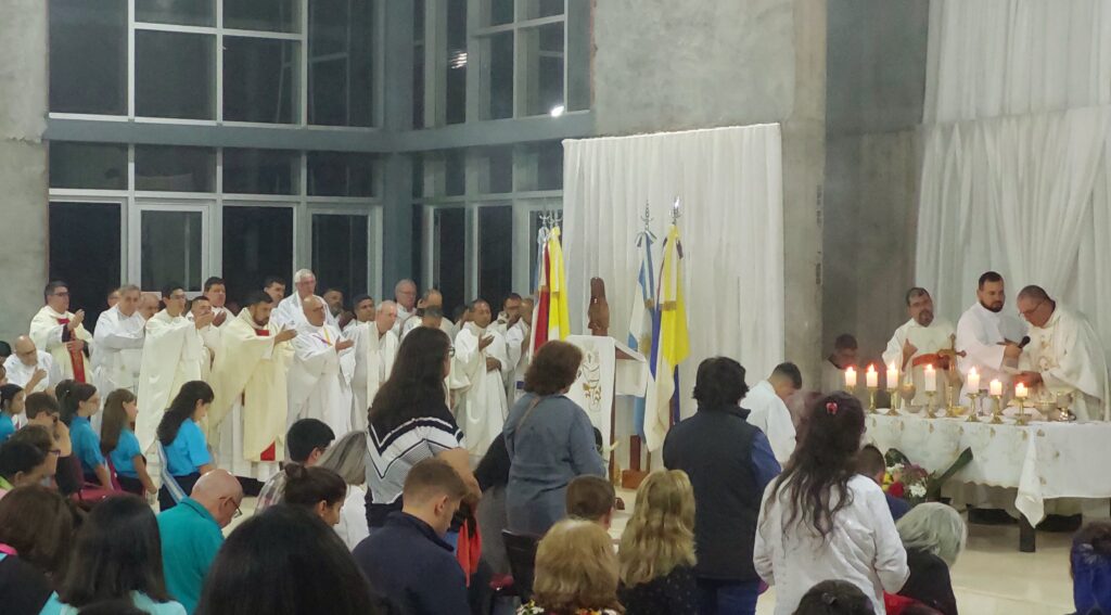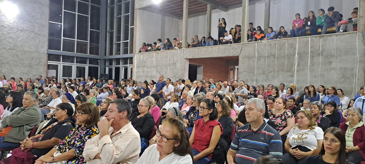 «Hemos venido de toda la Diócesis, que lindo ver llegar las distintas comunidades bajarse de los micros – más chicos, más grandes, de los autos – caminando de diferentes lugares con sus sacerdotes, religiosas para reunirnos hoy acá, en el altar del Señor», expresó Nicolás Baisi, Obispo de la Diócesis de Iguazú quien también señaló «que la Eucaristía nos reúne como familia de Dios, la Eucaristía nos hace familia de Dios, nos hace formar parte del Cuerpo de Cristo…»