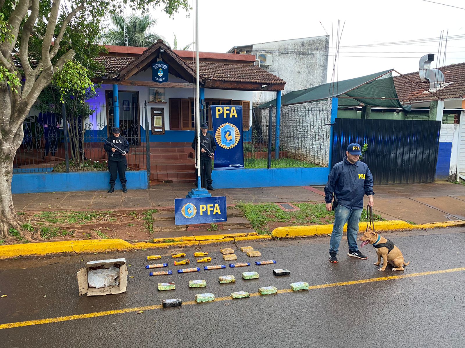 Ante la actitud del Can detector y el nerviosismo demostrado por el ciudadano, los federales solicitaron al mismo que exhibiera la caja, el cual una vez abierta pudieron notar que contenía a simple vista posiblemente para disimular varios paquetes de fideo, budines y galletitas, además de granos de café impregnados sobre varios paquetes rectangulares tipo panes que se encontraban ubicados por debajo de las mercaderías antes nombrada, las cuales al verificar resulto ser clorhidrato de cocaína a las cual se sometió a la prueba de campo dando positivo para esa sustancia, siendo cerca de 10 paquetes que rondaban cerca de los 10kg, aproximadamente y por lo que se pudo cotejar el monto de lo secuestrado daría un aforo próximo a los $15.000.0000, un procedimiento que hace tiempo no se tiene referencia ante tal magnitud dicho operativo se dio intervención al Juzgado Federal de Eldorado, que dispuso el secuestro de los estupefacientes encontrados y detención del ciudadano,