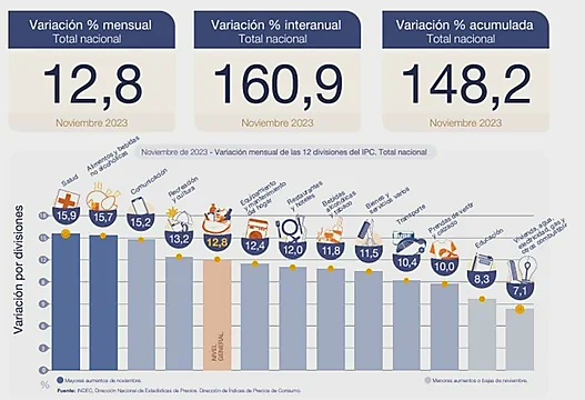 La inflación de noviembre, la última de la gestión Alberto Fernández-Sergio Massa, fue de 12,8% y así acumula 160,9% en los últimos doce meses.