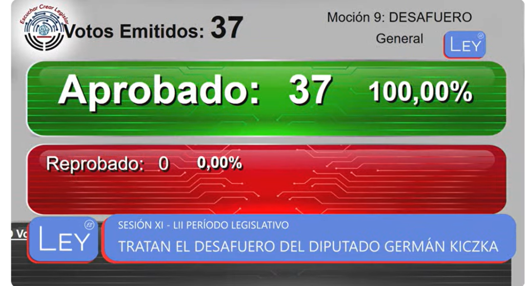 Con 37 votos afirmativos, y con la ausencia del Diputado en cuestión, la Cámara aprobó el desafuero de Kiczka, permitiendo que el legislador sea sometido a la acción de la justicia ordinaria.