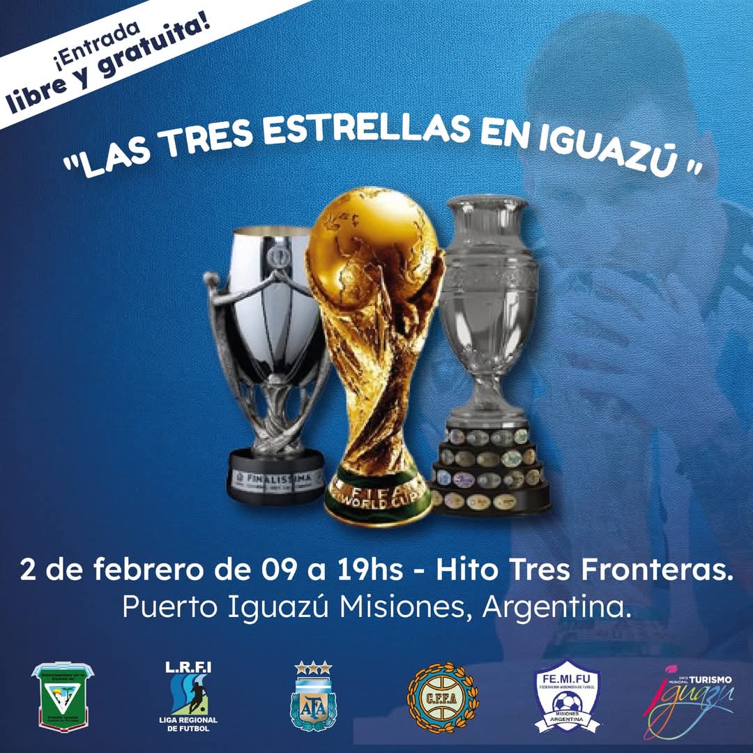 Los amantes del fútbol de Iguazú tendrán la oportunidad única de fotografiarse con las réplicas oficiales de los trofeos más importantes del fútbol argentino. El próximo domingo 2 de febrero, la Asociación del Fútbol Argentino (AFA) llevará las copas del Mundo, la Finalissima y la América al Hito Tres Fronteras, donde estarán expuestas de 9:00 a 19:00.